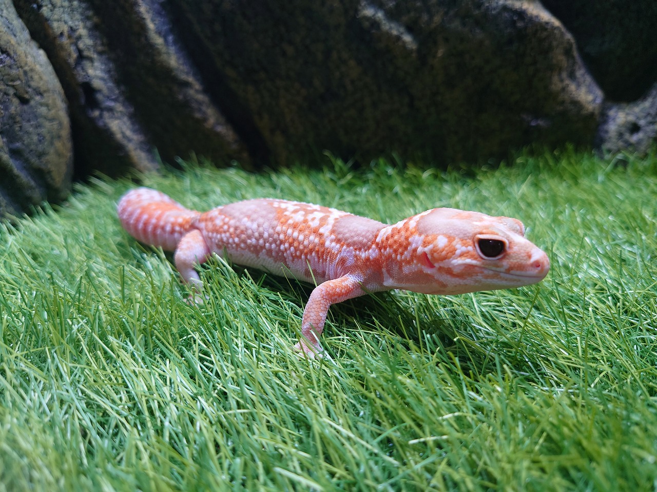 まるでおとぎ話から飛び出してきたかのような幻想的なピンクの体に黒いスポットが美しく映える、可愛さと神秘さを併せ持ったこの子は、ちょこちょこと人工芝の上を歩く姿もたまらなくキュートで、初めての方にも安心して迎えていただける性格のニシアフリカトカゲモドキ、ホワイトアウトオレオパターンレスというとってもレアなヤモリさんです🐸💕🌈😍、きっとあなたの暮らしに小さな癒しと大きなトキメキを届けてくれますので、気になる方はぜひお気軽にお問い合わせくださいね✉️❤️😊。