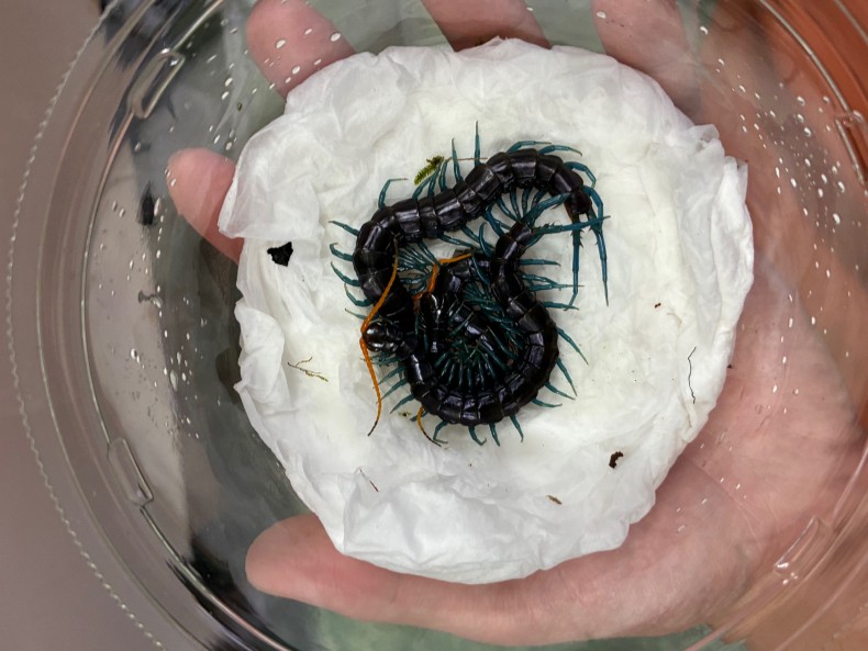 ルソン島原産の美しい青みがかった脚色が特徴的な大型ムカデです。