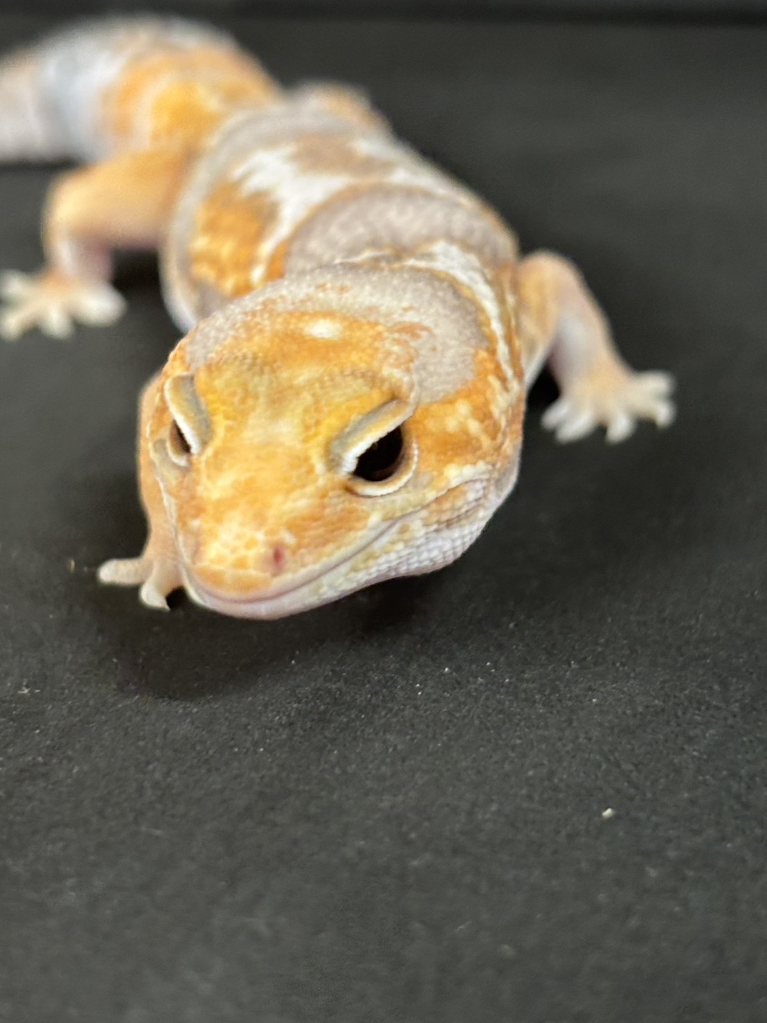 ホワイトアウトアメルは白基調の体色にアメルのオレンジ模様が特徴的です。現在15cmほどで尻尾も太く健康的な個体です。
