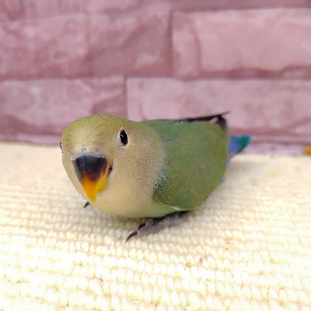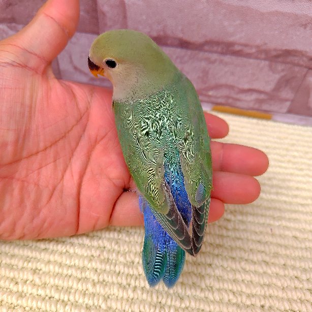 淡いグリーンに青い尾羽がとても美しい、シーグリーンカラーのコザクラインコの雛です。