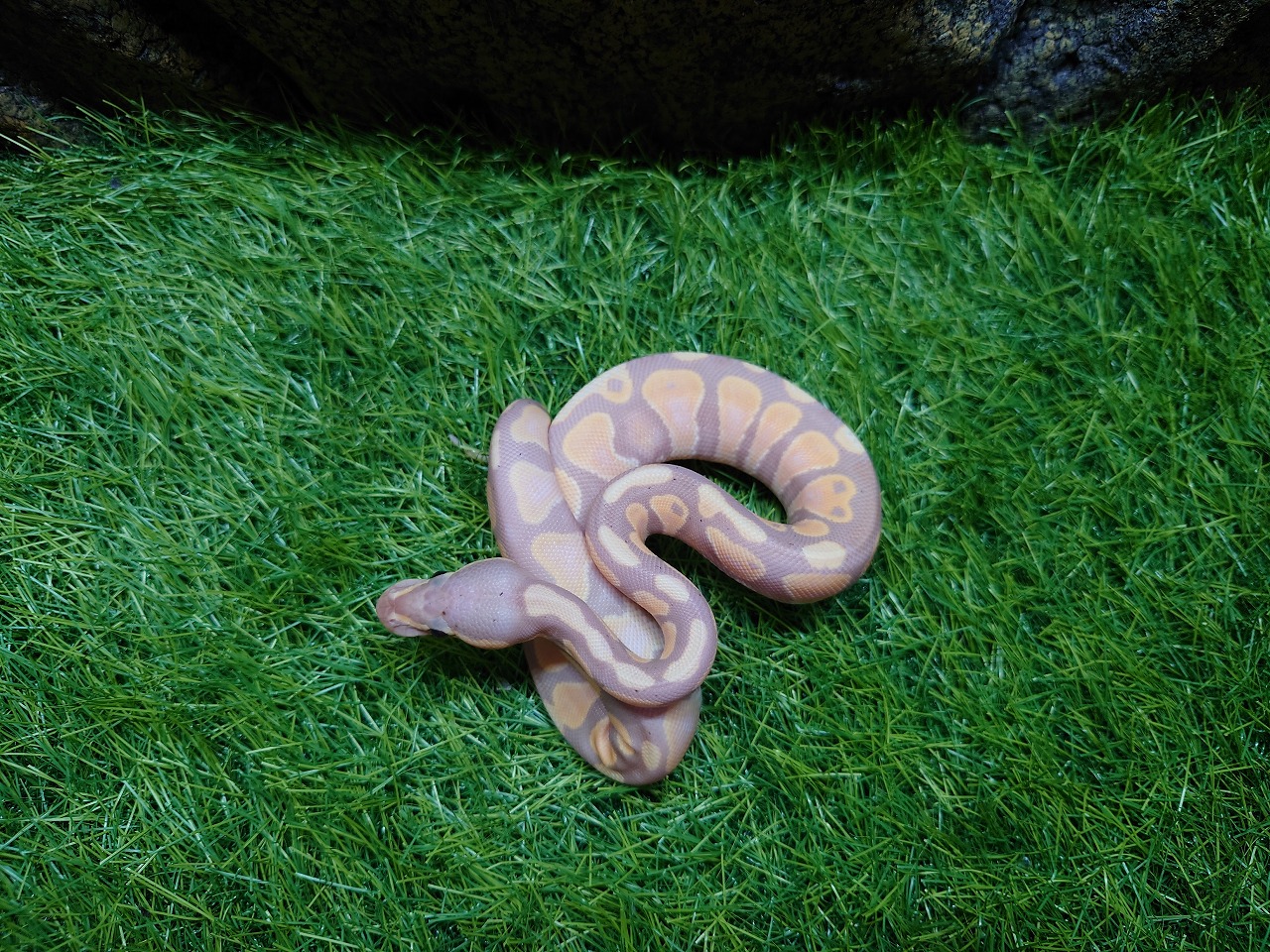 バナナカラーのボールパイソンは、穏やかな性格と落ち着いた動きで、