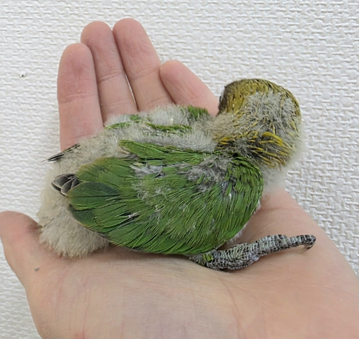 グリーンを基調に、顔まわりのオレンジとイエローが映えるルリコシボタンインコのヒナです🦜