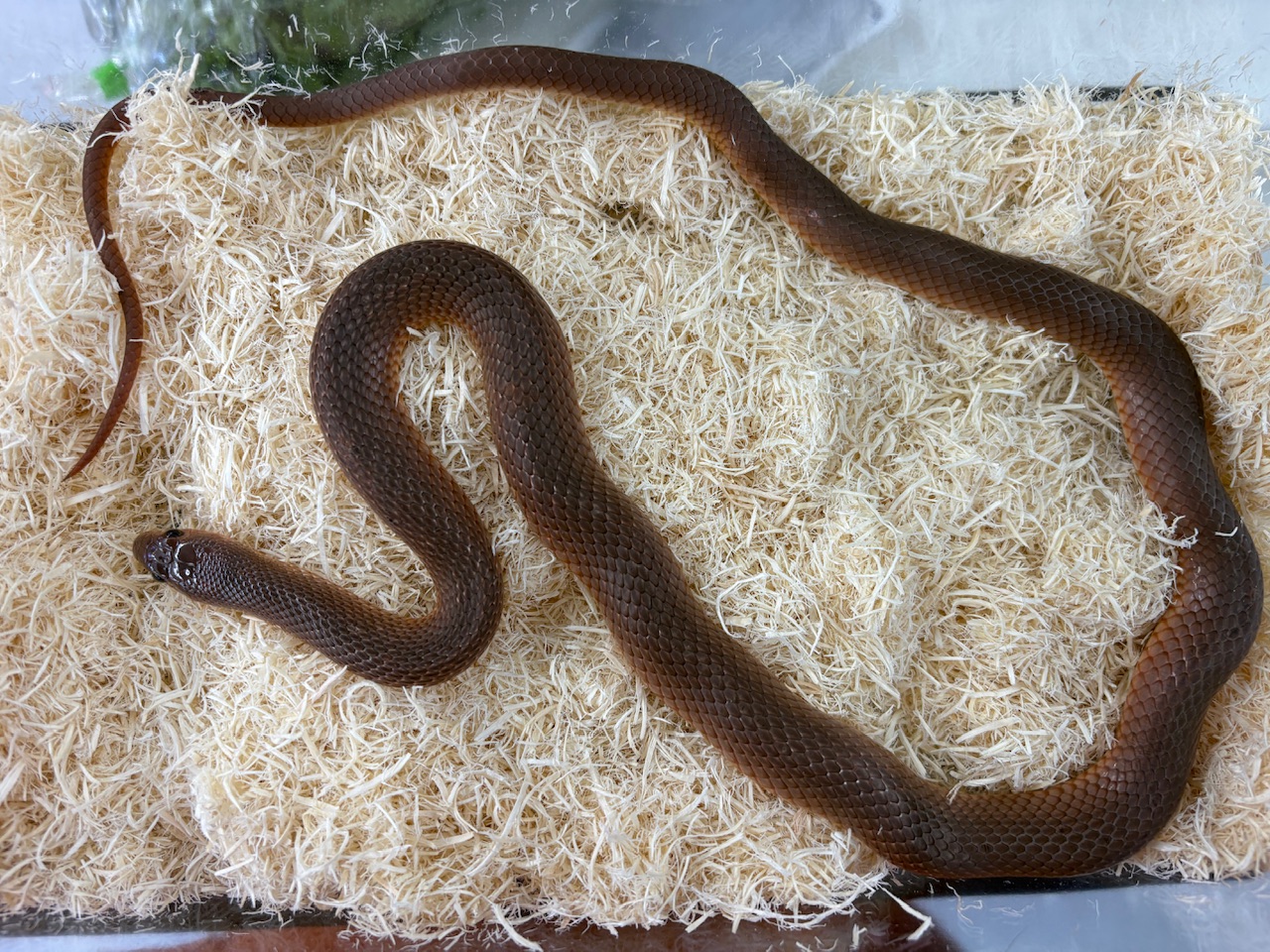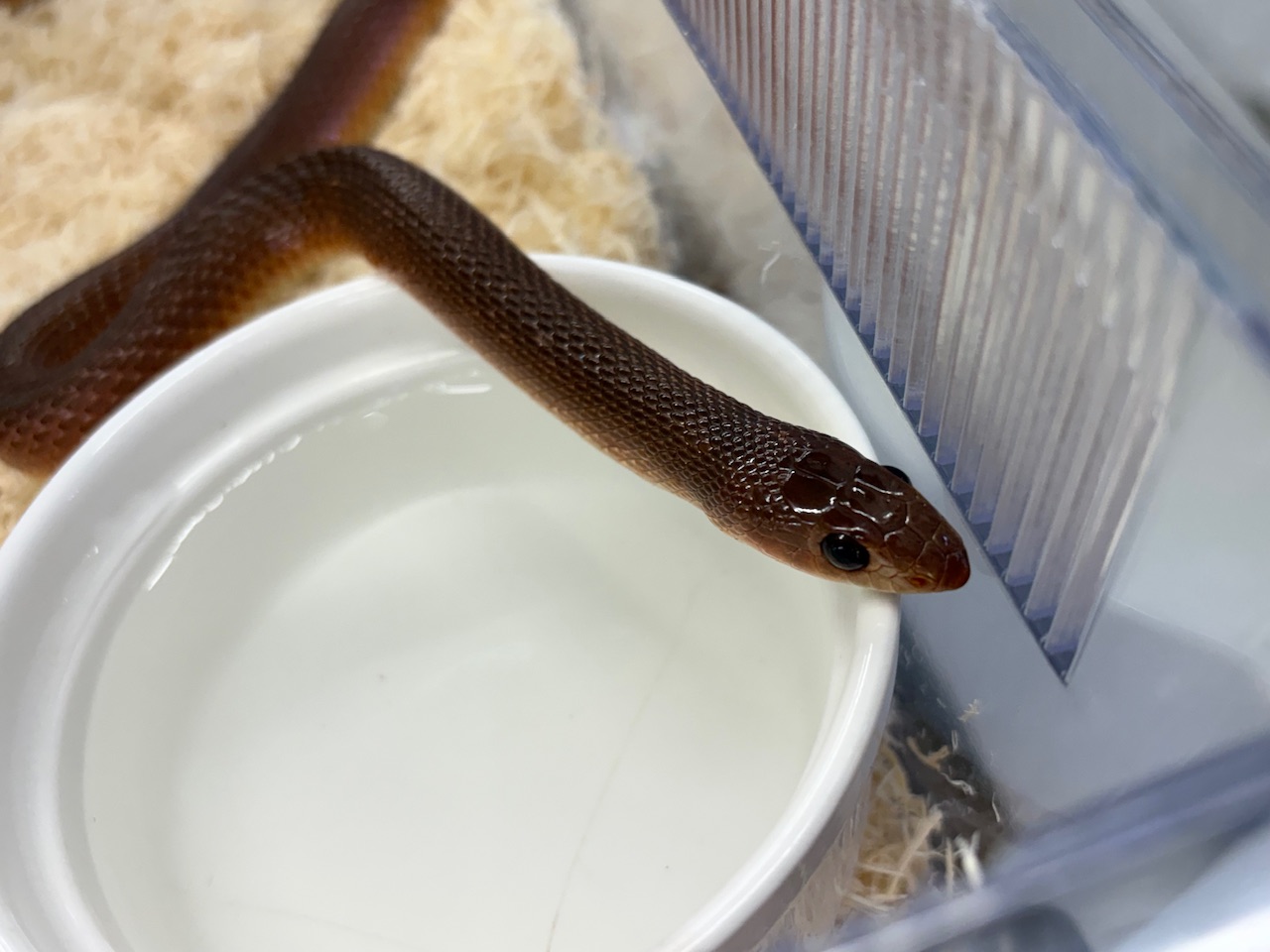 WC(ワイルドキャッチ)ならではの引き締まった体つきと、赤褐色~ダークブラウンの美しい体色が印象的なアカクチバシヘビです。全長約60cm±と程よいサイズ感で、レイアウト水槽でも存在感をしっかり楽しめます。床材の上をゆったりと移動する様子や、水入れを利用する姿も確認でき、環境への順応性も感じられる個体です。