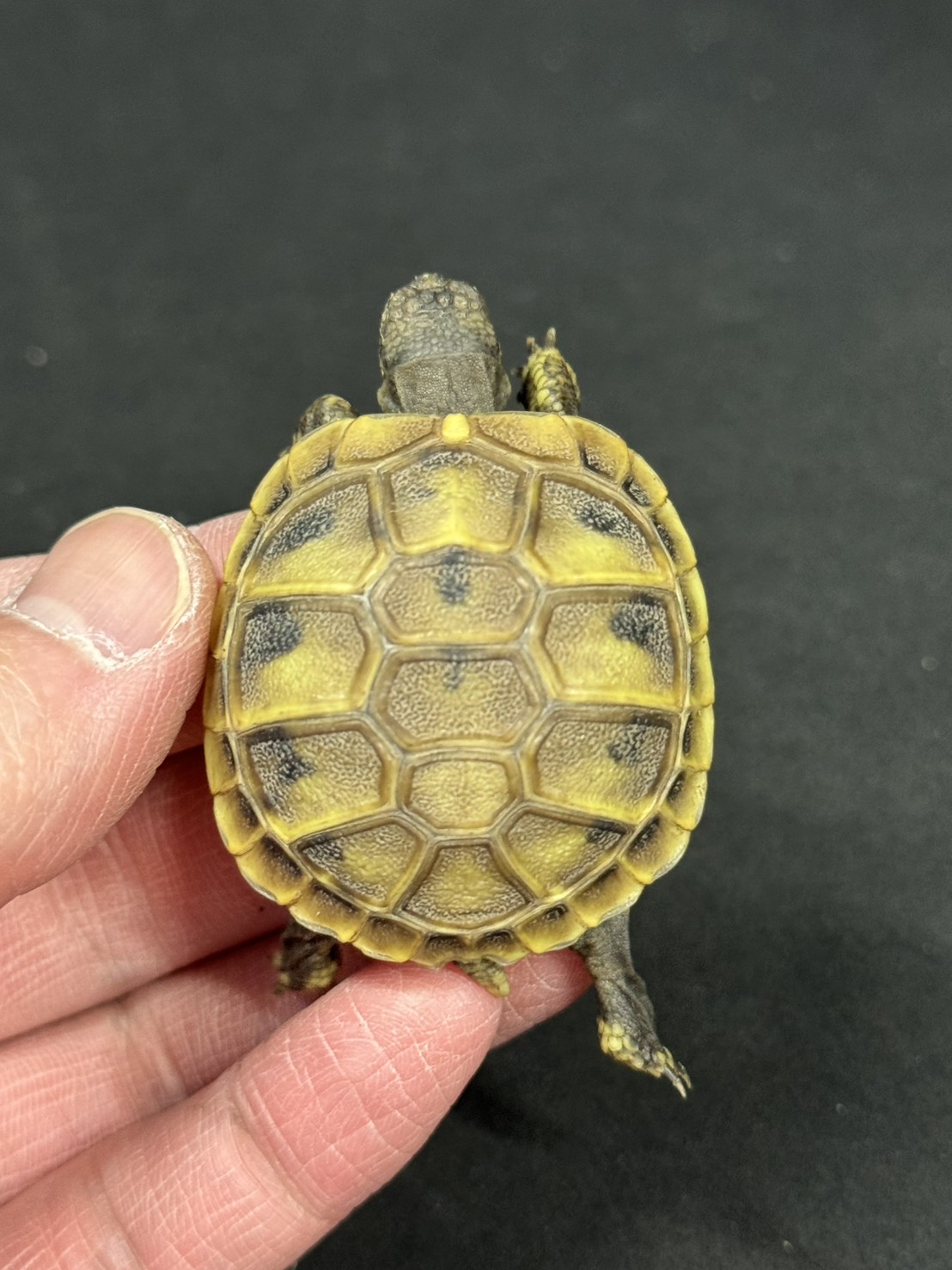 ヨーロッパ原産の丈夫なリクガメ、ヒガシヘルマンリクガメ。黄色と黒のコントラストが美しく、活発で人に慣れやすい個体も多い人気種です。腹甲の黒斑パターンや甲羅の色味に個体差があり、成長とともに模様がはっきりしていきます。