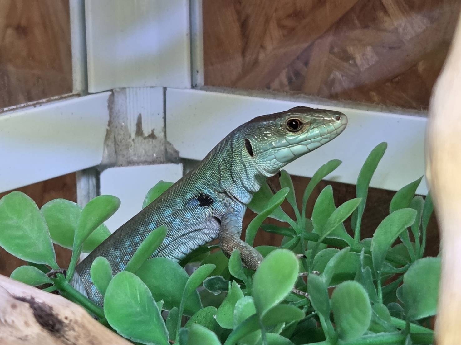 環境に慣れるとバスキングをする姿や、ケージ内を探索する様子もじっくり観察できます。