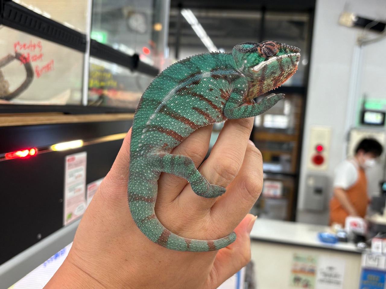 鮮やかなグリーンをベースに、レッド~オレンジの差し色が入る美しい体色。