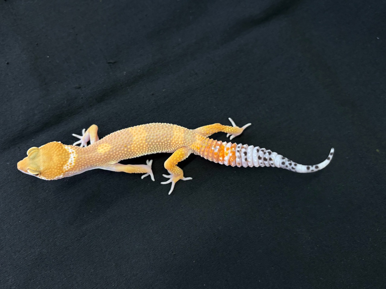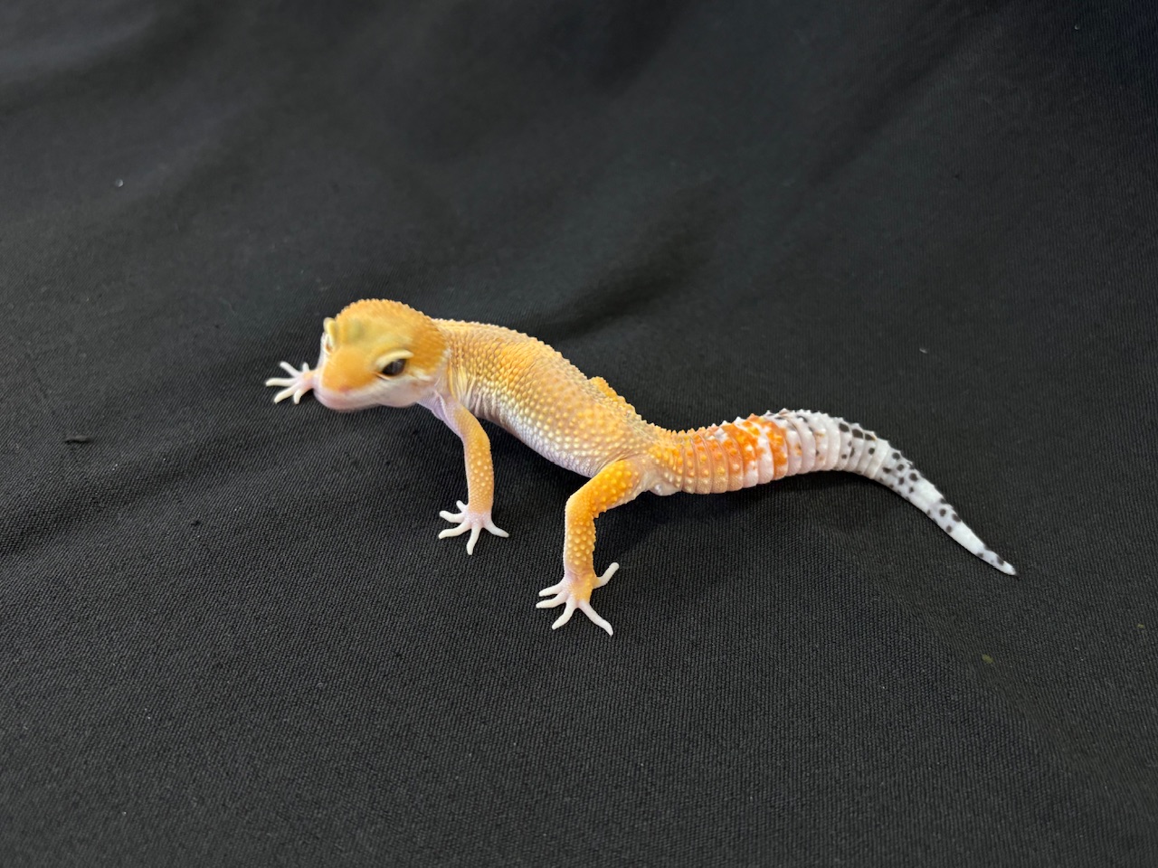 明るく柔らかなオレンジカラーが美しいレオパードゲッコー タンジェリン。全長約12cm±、2025日本CBの安心個体です。
