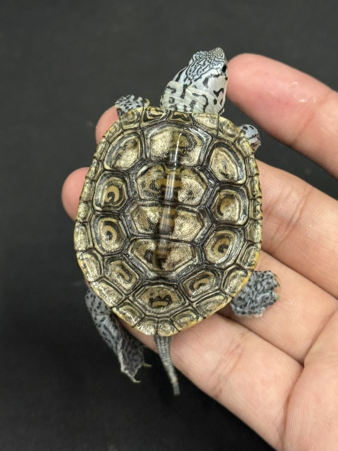 グレーを基調とした甲羅に、繊細な同心円状の模様が浮かび上がるカロリナダイヤモンドバックテラピン。名前の通り“ダイヤモンド”のように見える甲羅のパターンが最大の魅力で、光の当たり方によって印象が変わります。頭部や四肢に入る細かなスポット模様も美しく、水棲ガメの中でも観賞価値の高い種類です。