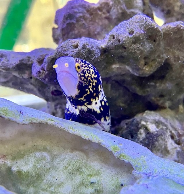 独特な網目模様が魅力のクモウツボです。現在の体長は約30cmで、存在感のあるサイズ。岩組み水槽や隠れ家を多く設置したレイアウトでの単独または大型魚との混泳がおすすめです。