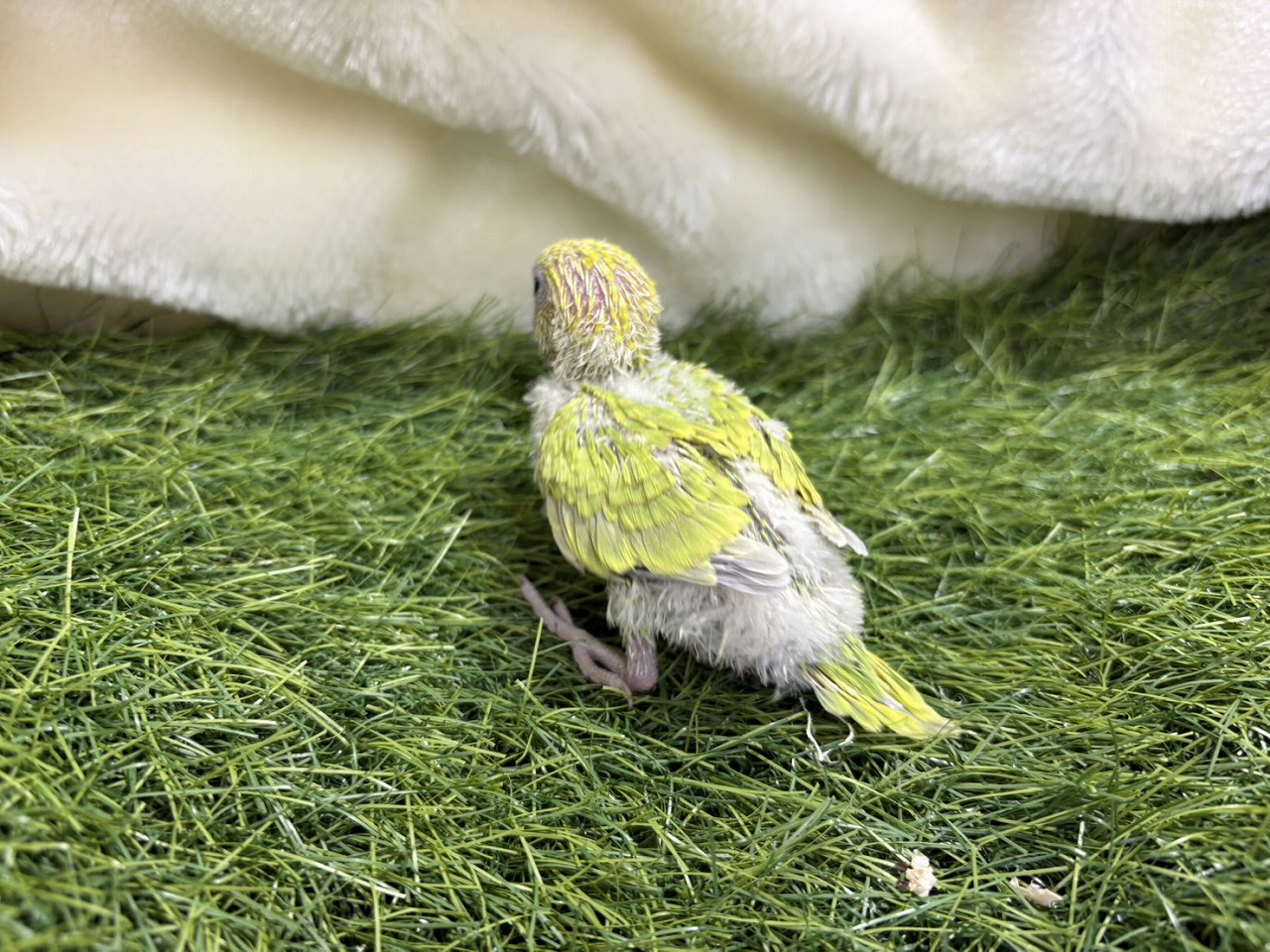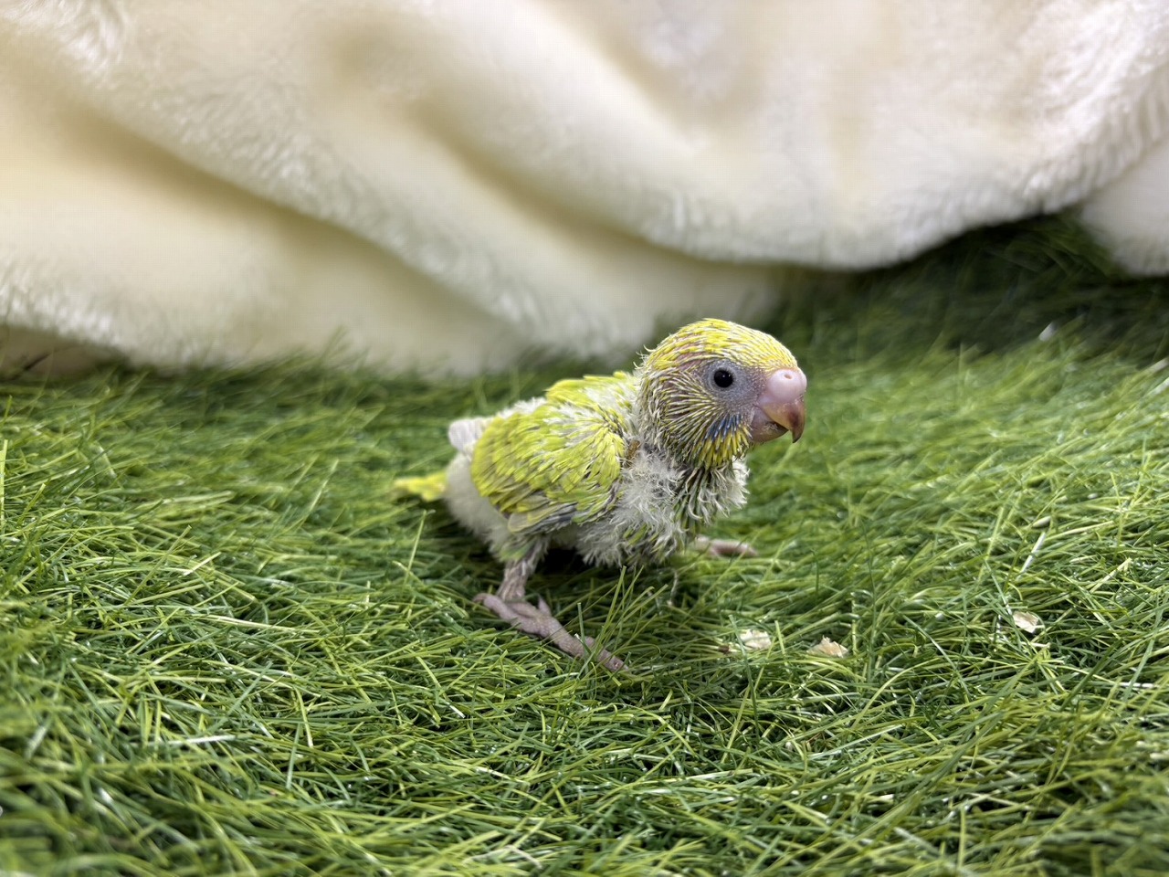 手のひらでちょこんと立つ、黄緑色のセキセイインコの雛ちゃん。まだふわふわの羽とあどけない表情がとても愛らしく、見ているだけで自然と笑顔になれる子です❤️