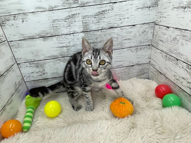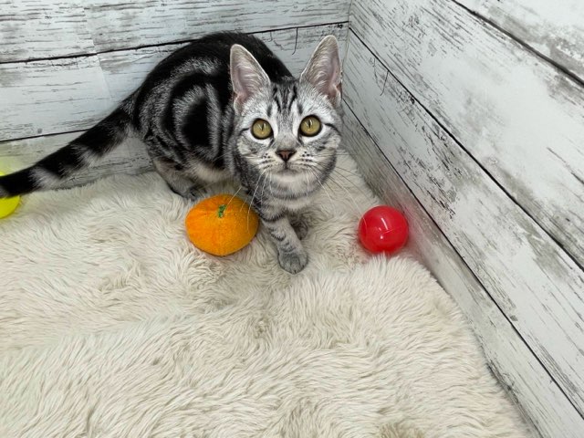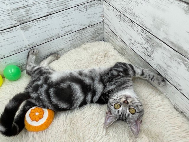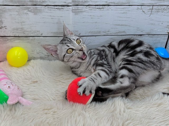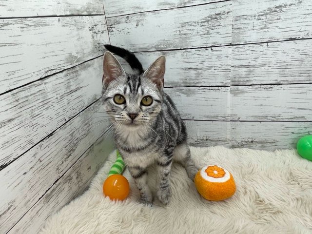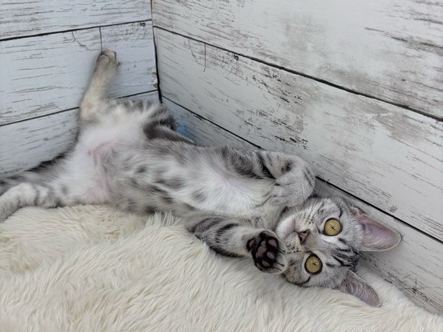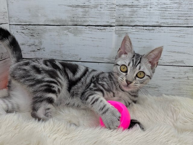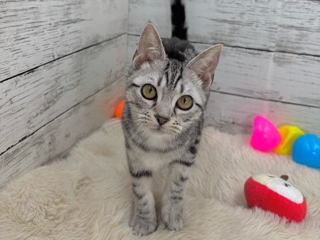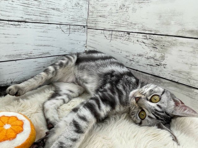 美しいシルバーの毛並みにくっきりとしたタビー模様が映える、アメショの女の子です❤️