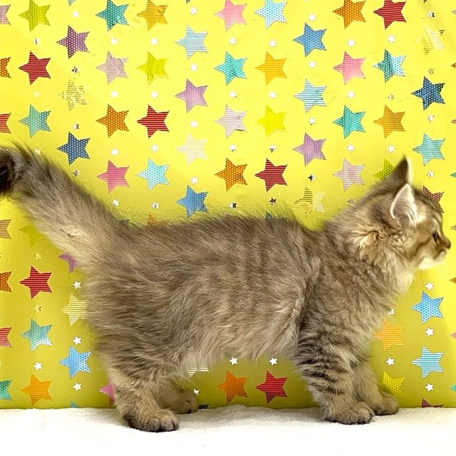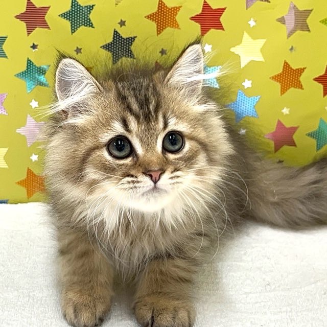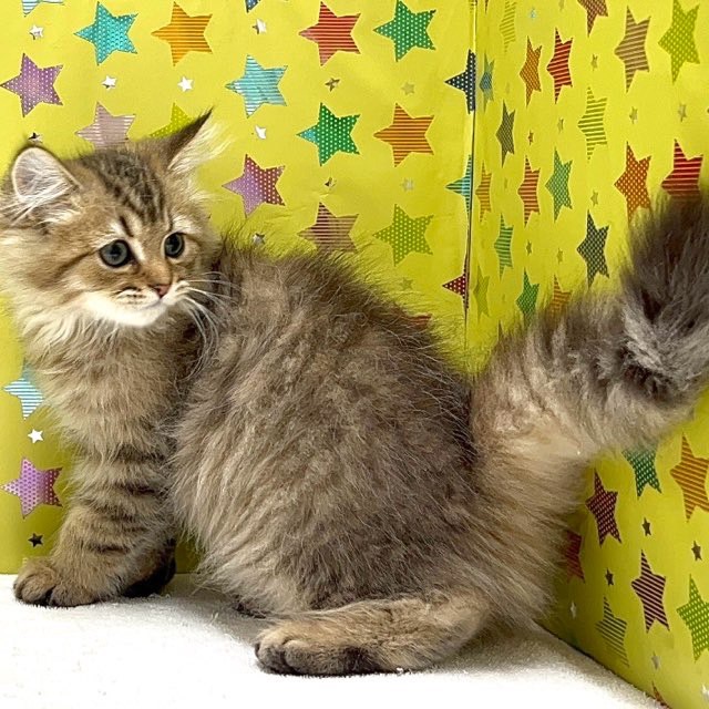 お写真のとおり、ブラウン系のタビー模様に白いあご、耳先のふさふさがとっても上品です🐾。