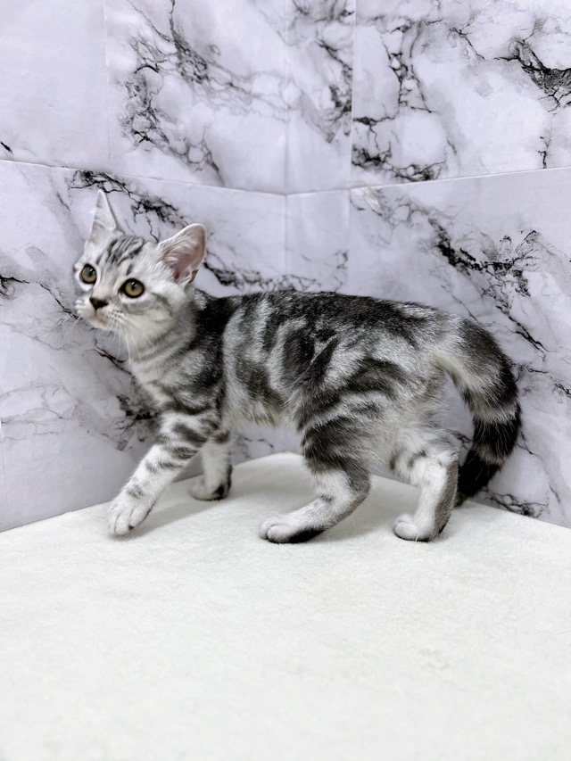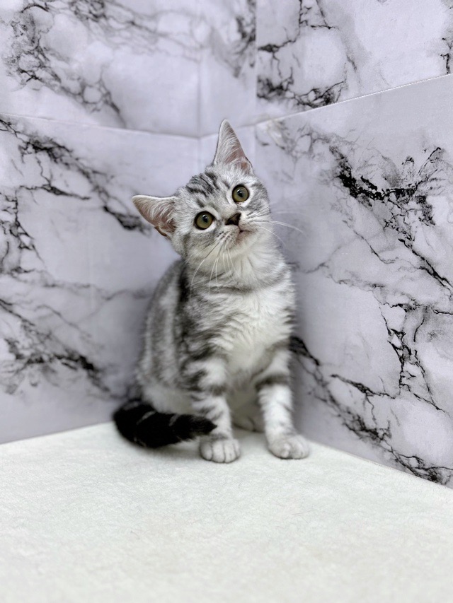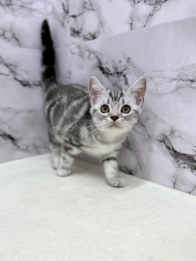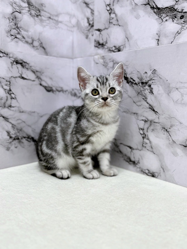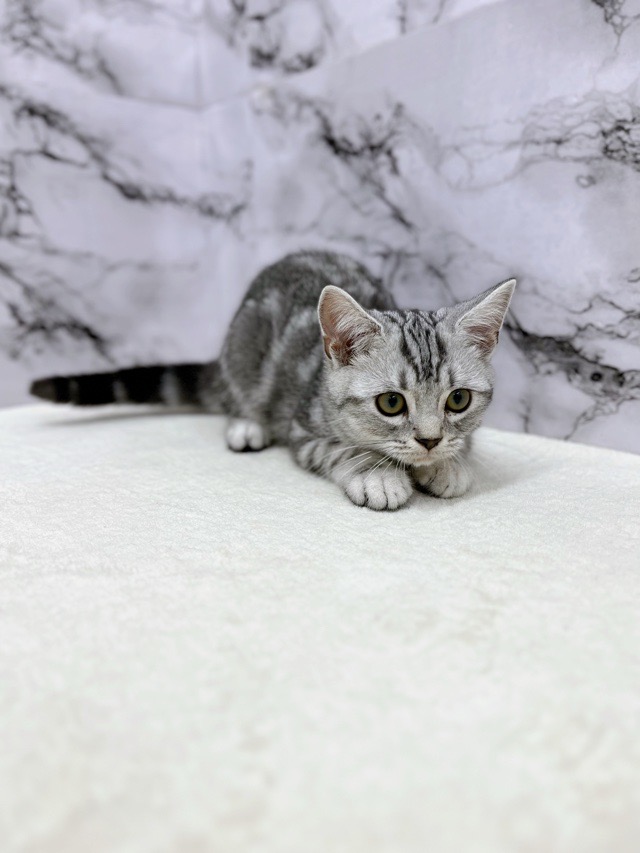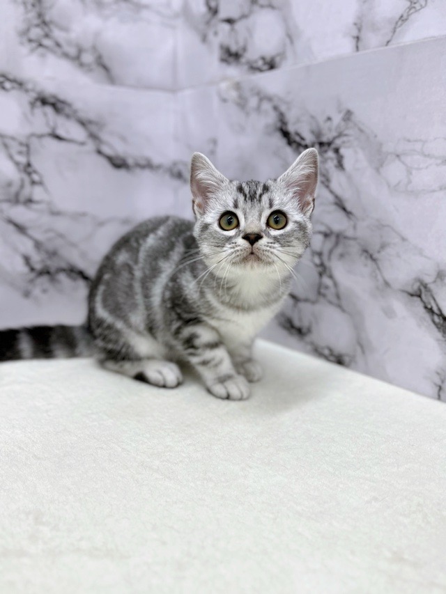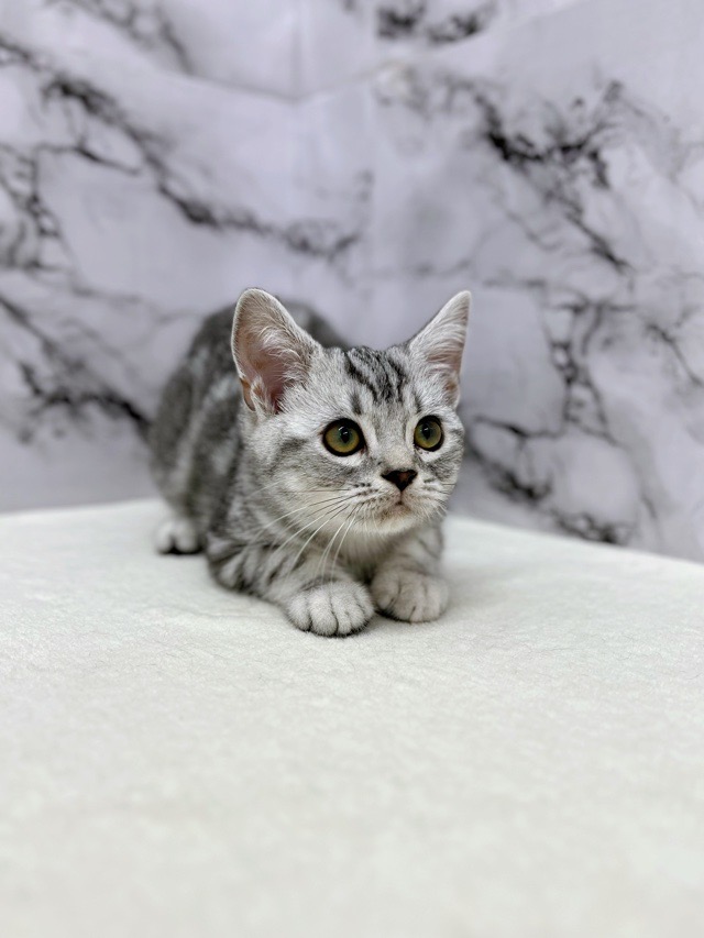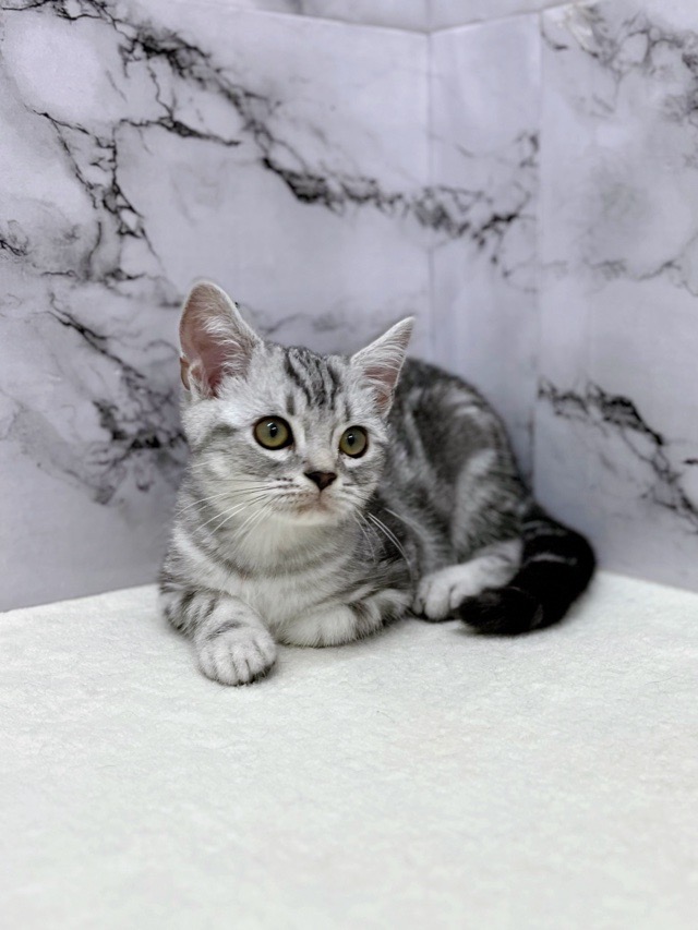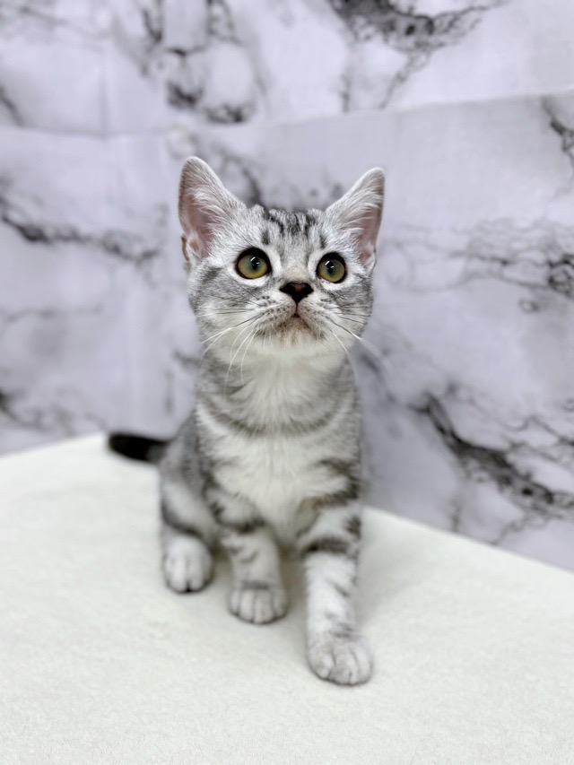 柔らかなシルバータビーの被毛に包まれた、アメリカンショートヘアの男の子。