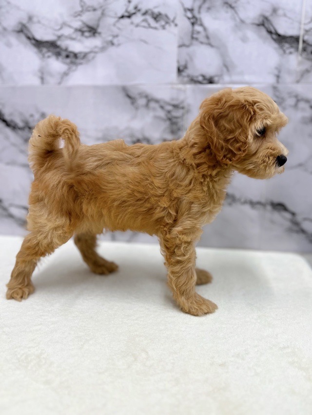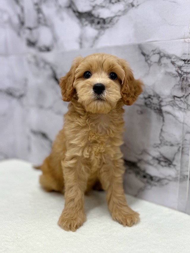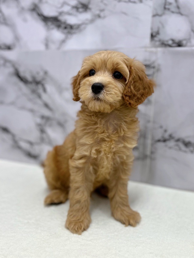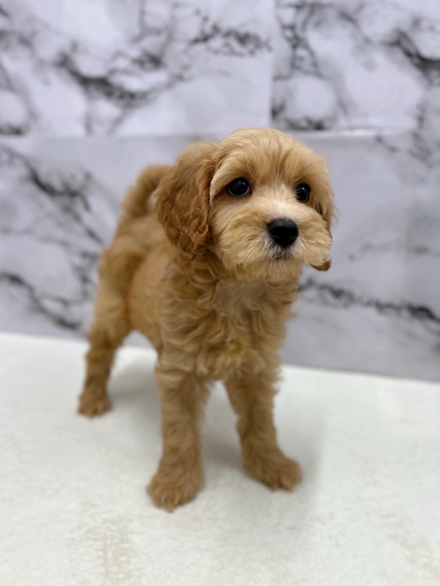 レッドの毛色がゴールドに近いあたたかさを放つ、このキャバリア×トイプードルのMIXくん。触れるとふわっと香るやさしい被毛が、思わず撫でたくなる質感です。