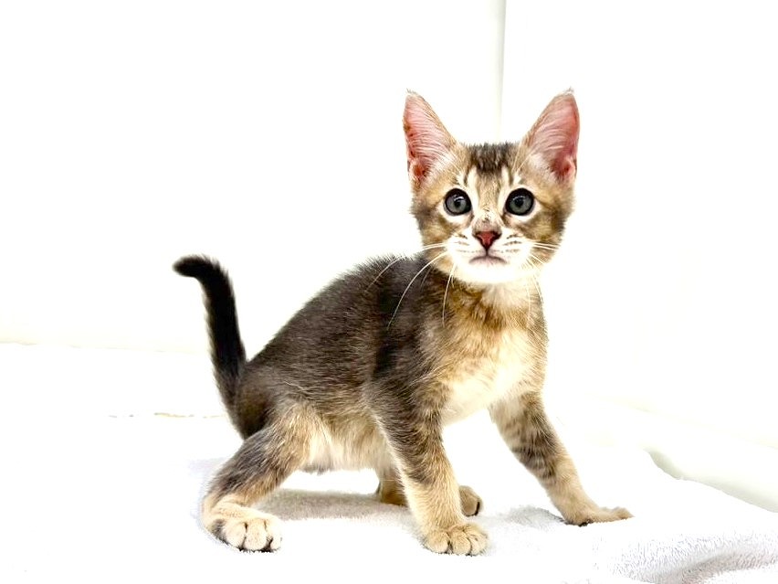 まず!この子はソマリとベンガルの良いところをギュッと受け継いだブルータビーの美しい毛色が目を引きます。茶色っぽいブルータビーの色味に、ベンガルらしいしなやかでスラッとした体型、そしてソマリ譲りの柔らかい毛質が絶妙に合わさった魅力的な子です。