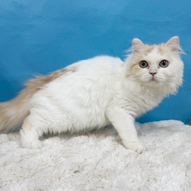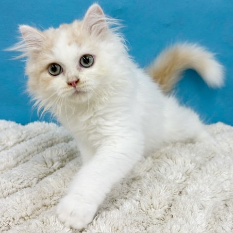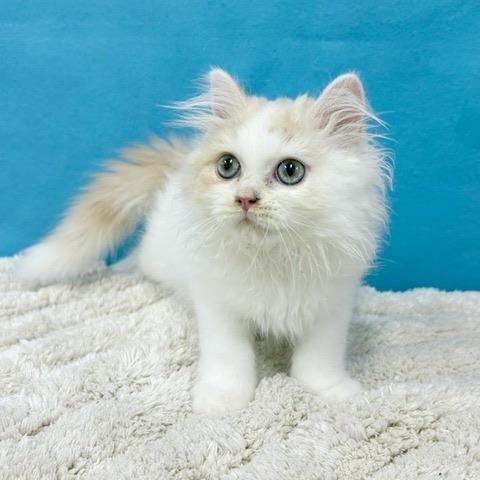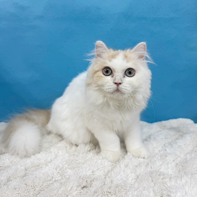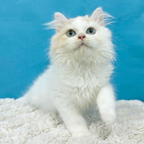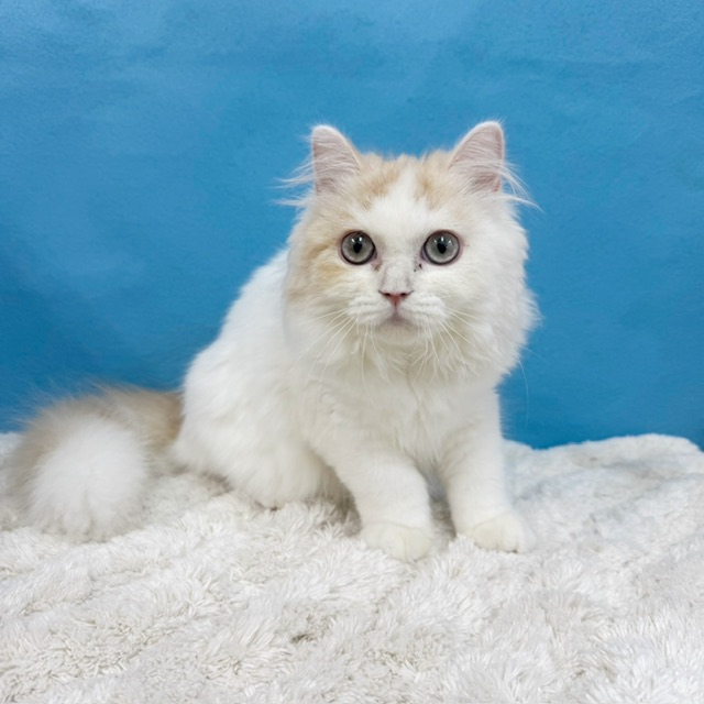 ホワイトベースにクリームカラーがほんのり入った毛並みと、澄んだブルーグリーンのおめめが魅力的。