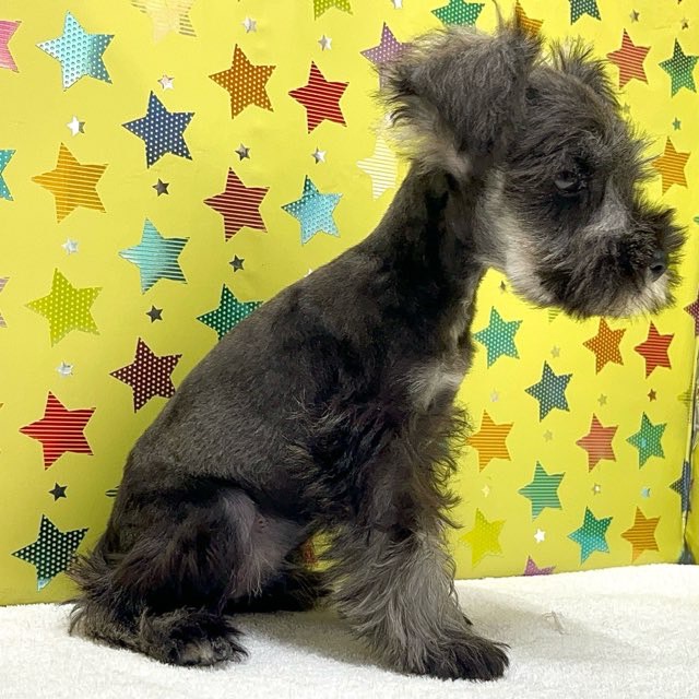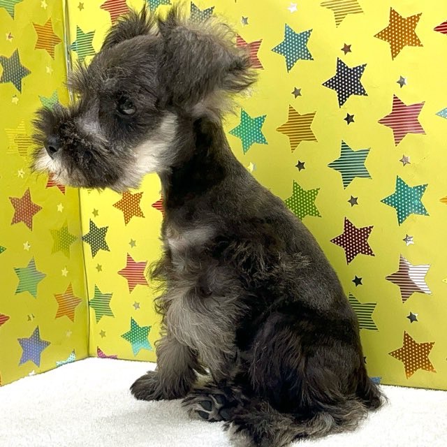 トリミングしたてのきれいな毛並みと、長いまつ毛のようなおめめ周りがチャームポイント。