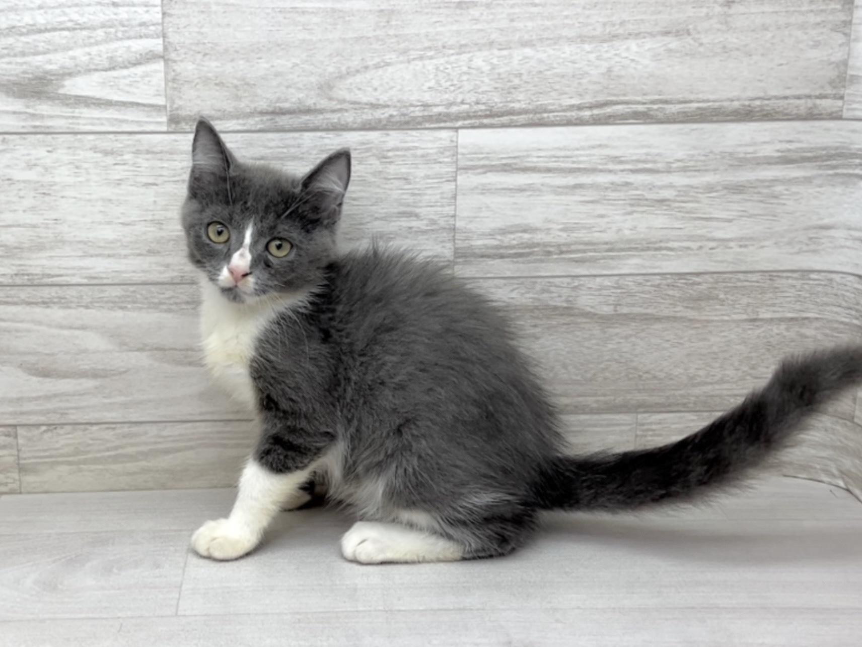 優雅で愛らしいブルー&ホワイトの被毛が特徴で、足長タイプならではのすらりとしたシルエットが目をひきます。毛の発色は清潔感があり、まるで淡い水彩画のようなグラデーションを感じさせる色合いです。手足が長いため、優雅な動きが一層美しく映え、遊ぶ姿や歩く姿がとてもフォトジェニック。人懐こく、好奇心旺盛で遊び好きな性格は、新しい環境でもきっとすぐに家族の一員として溶け込むことでしょう