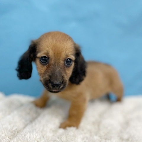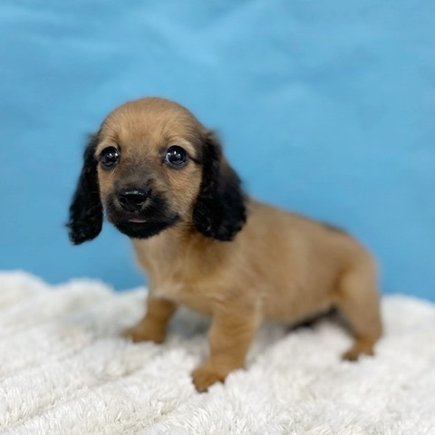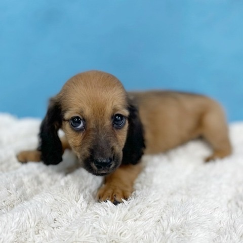 すらっとしたダックスらしいシルエットで、ふわふわブランケットの上におすわりする姿がとっても上品。思わずなでなでしたくなる、やさしい雰囲気に包まれています。💛