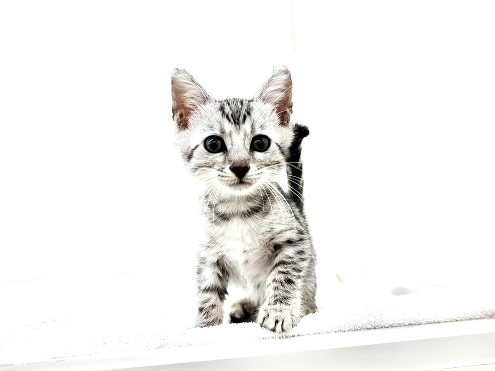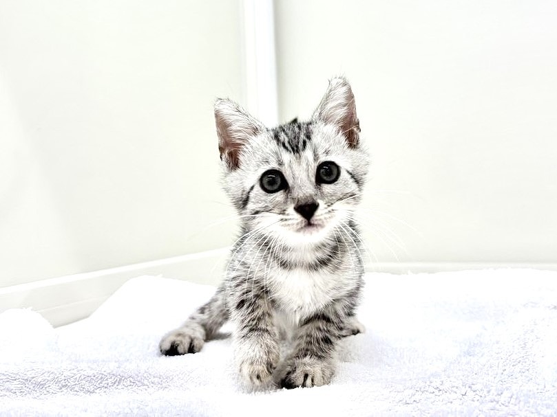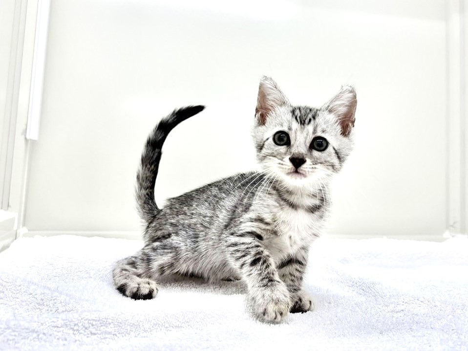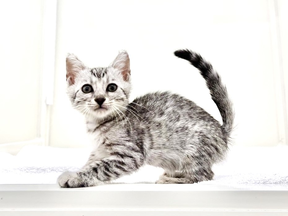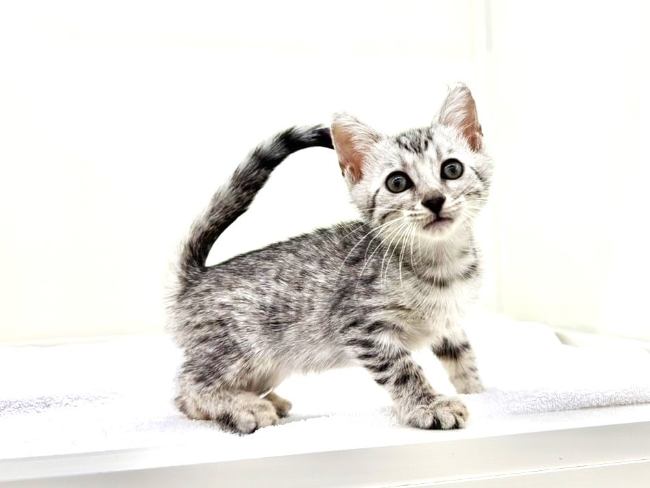 毛色はシルバースポテッドタビー!ベンガルちゃん特有の小柄ながらもスラッとしたスタイリッシュな体型が魅力的で、毛並みの模様がくっきりとしているため、見る角度によって表情が変わるのもこの子ならではの美しさです(´ω`)