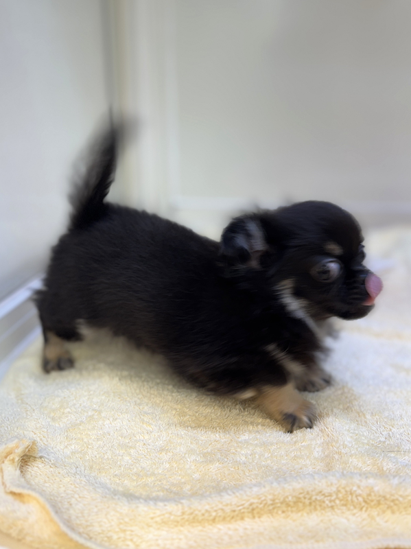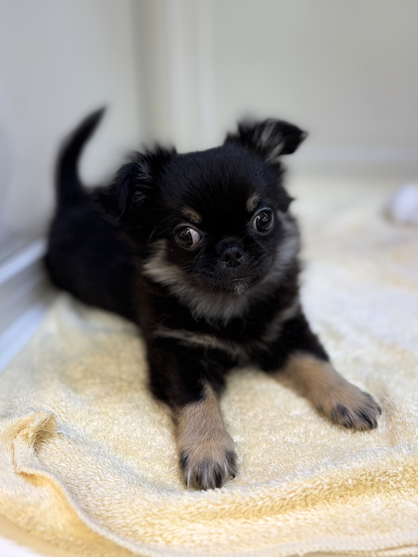 ブラック&タンのふわふわした毛並みは、ポメラニアン譲りの愛らしさと、チワワのキュッとした表情が絶妙にミックスされた特別感たっぷりのスタイル。