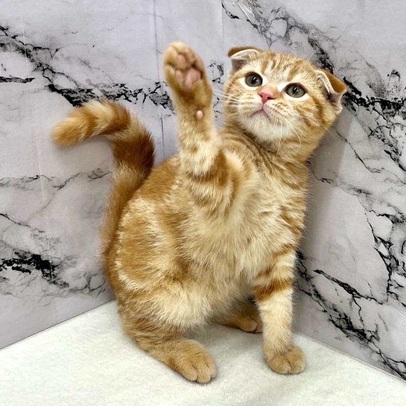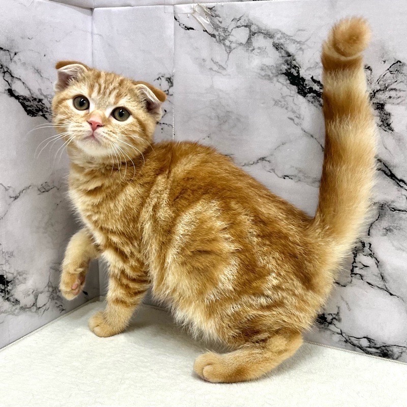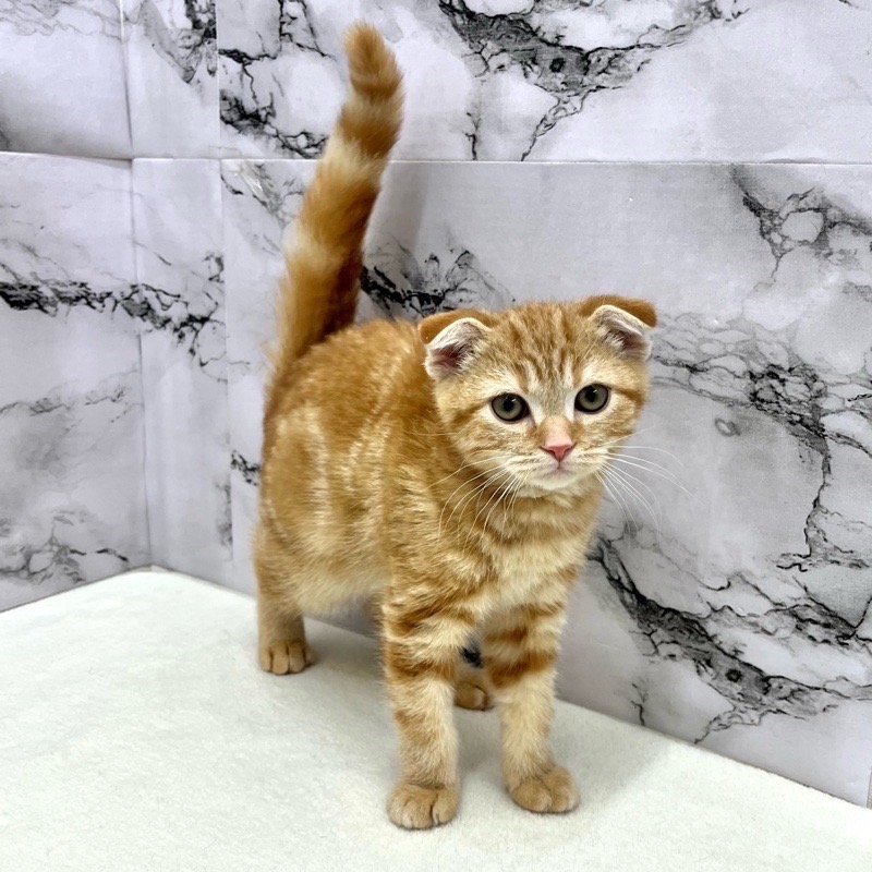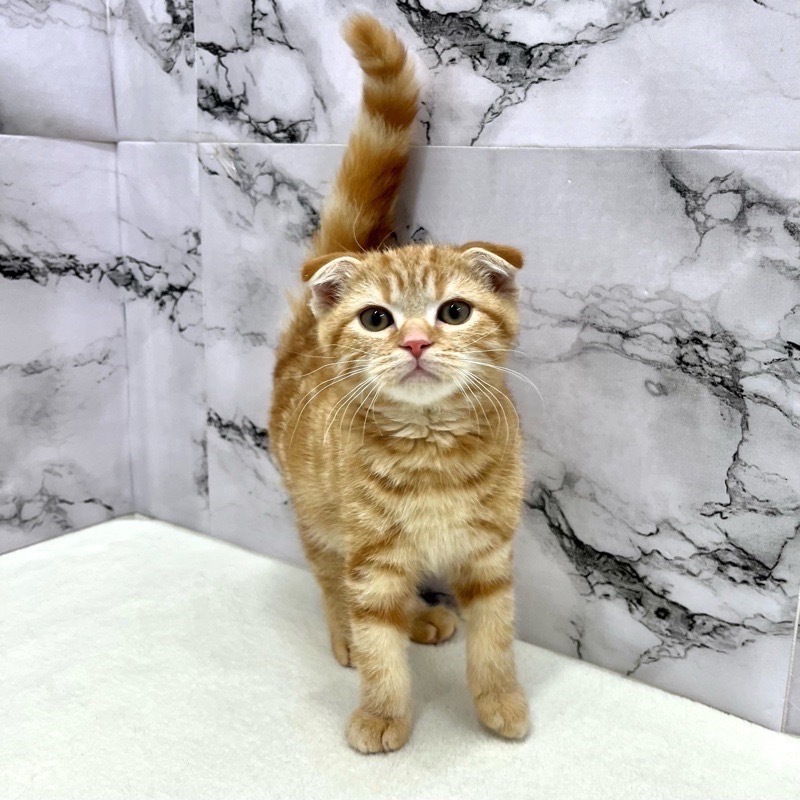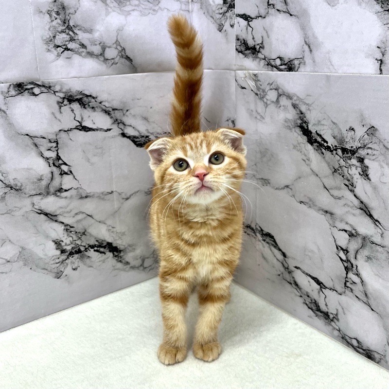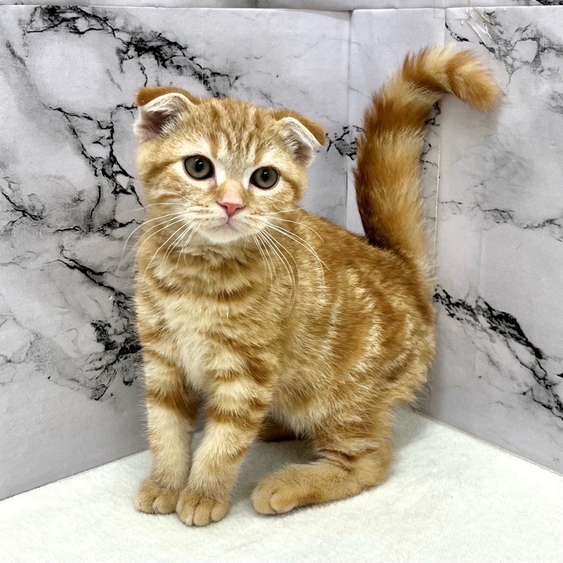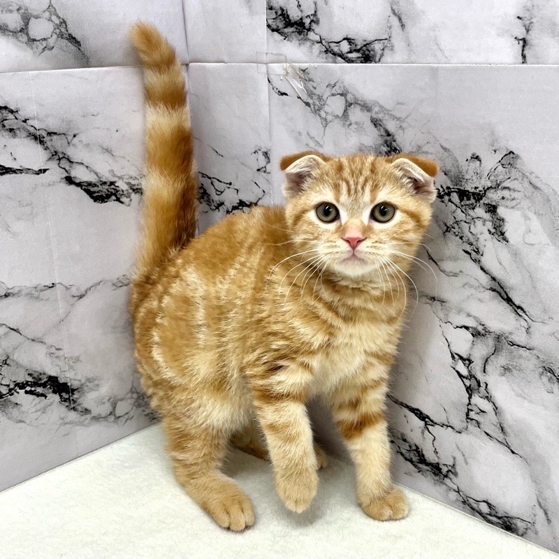 スコティッシュフォールドらしい柔らかな顔立ちと、やさしく垂れた耳が印象的な男の子。レッドタビーのあたたかみある毛色が、穏やかで落ち着いた雰囲気を引き立てています。