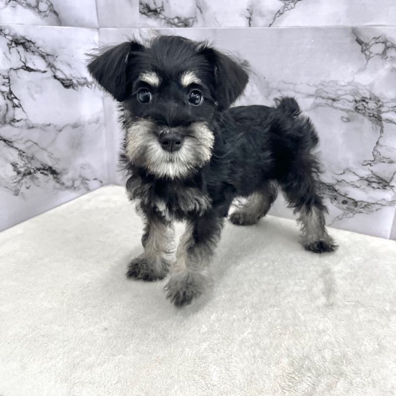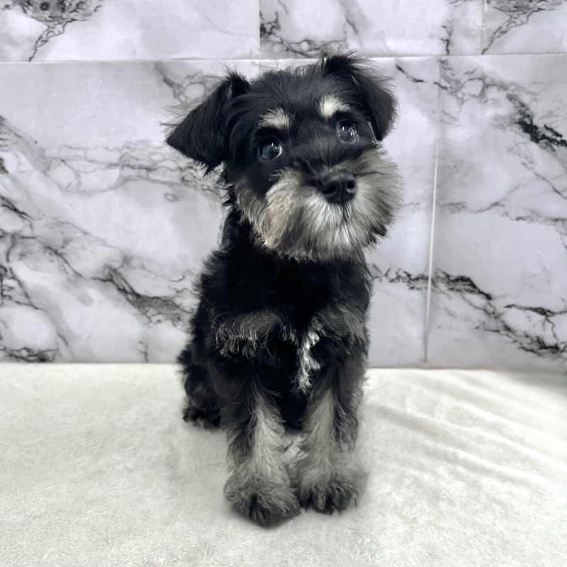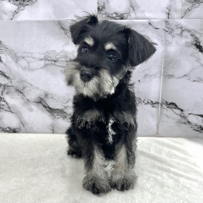 つぶらな瞳とふわっとした口まわりが愛らしい、ミニチュアシュナウザーの女の子。