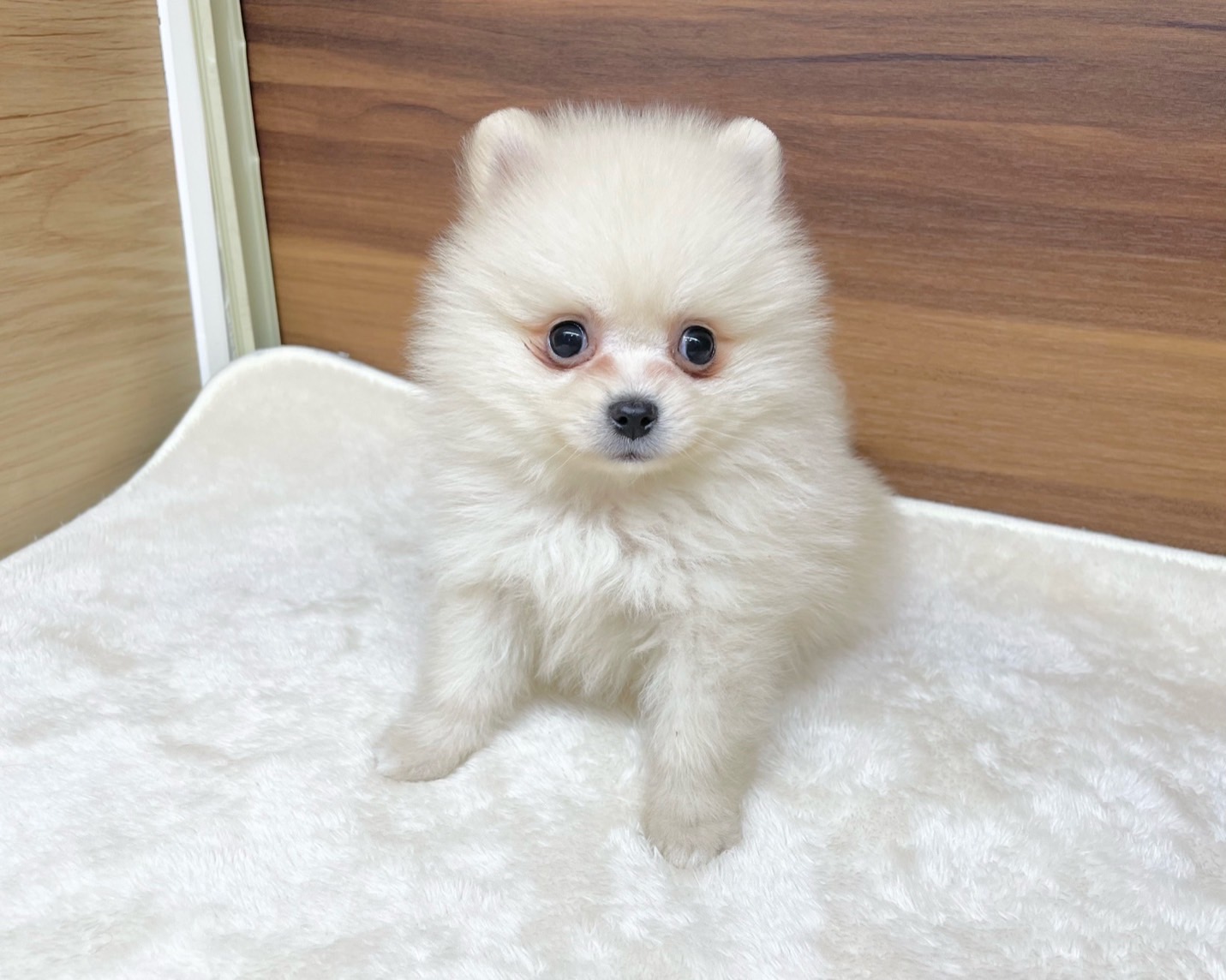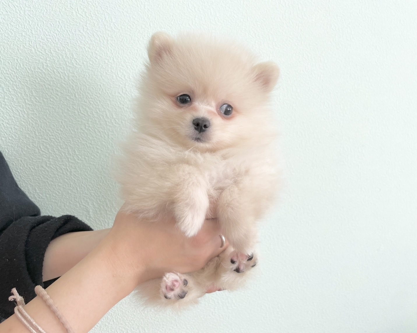 ふわふわのクリームカラーがとても美しい、小さな小さなポメラニアンの男の子です。まるでぬいぐるみのような柔らかいフォルムと大きなうるうるおめめが特徴で、初対面の方でも思わず抱きしめたくなる可愛さです。