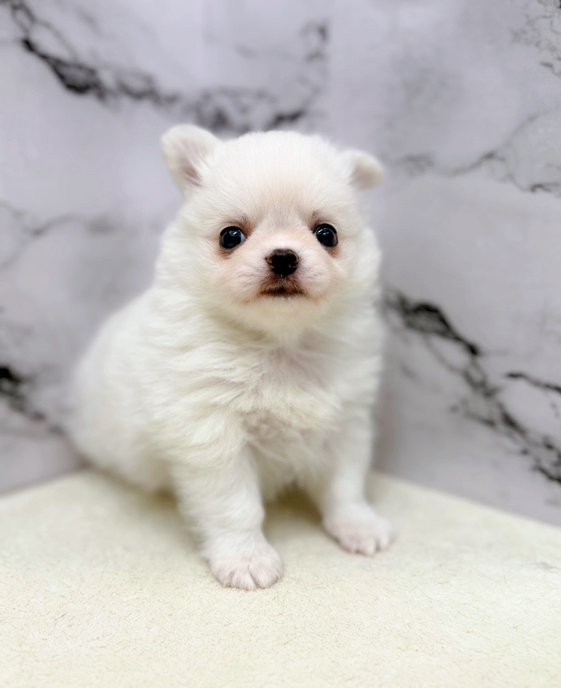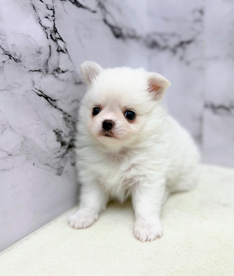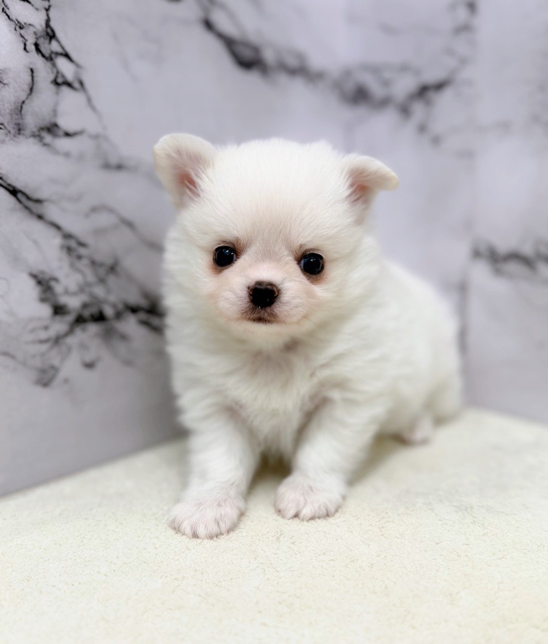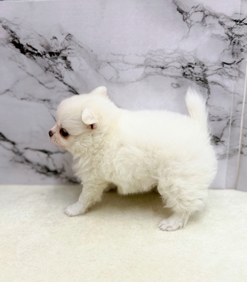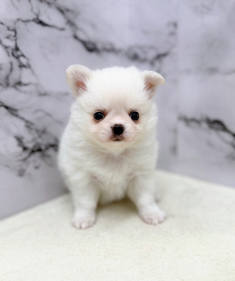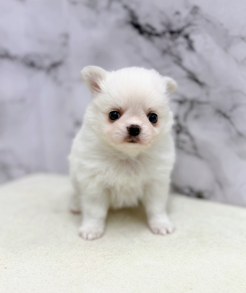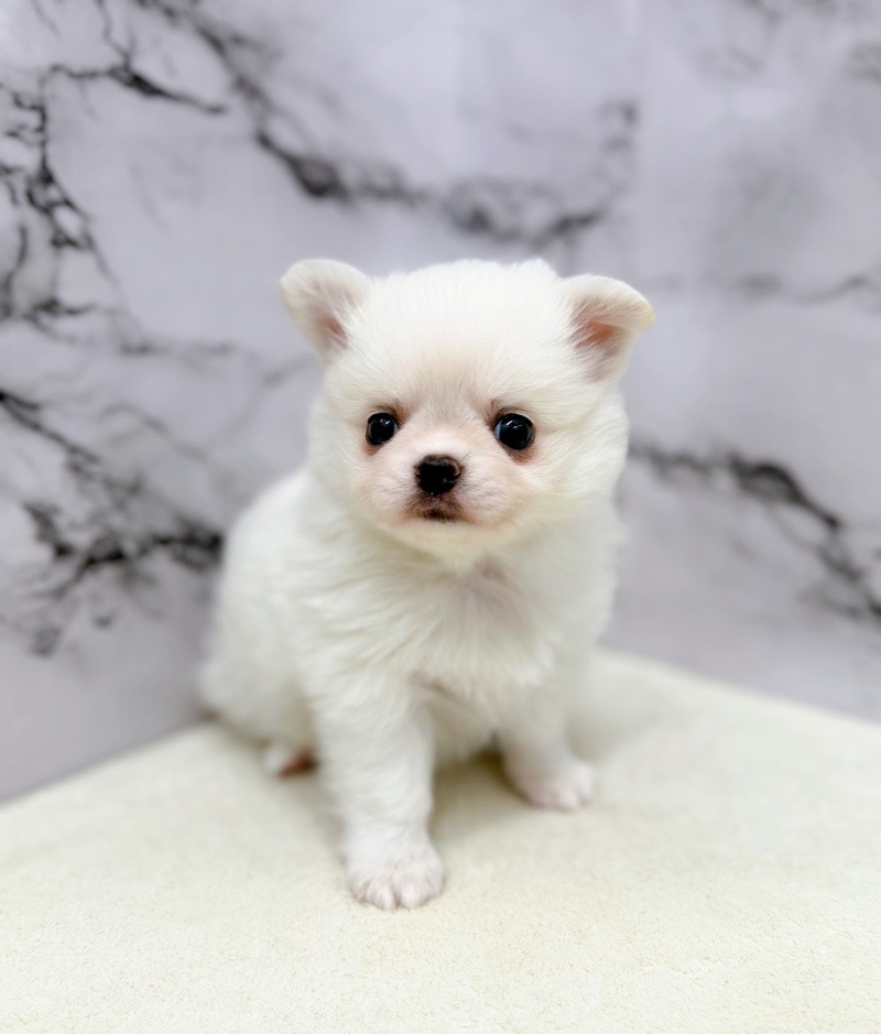ポメラニアンとチワワの魅力を受け継いだ、まっしろでもこもこの男の子です。