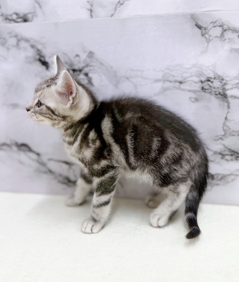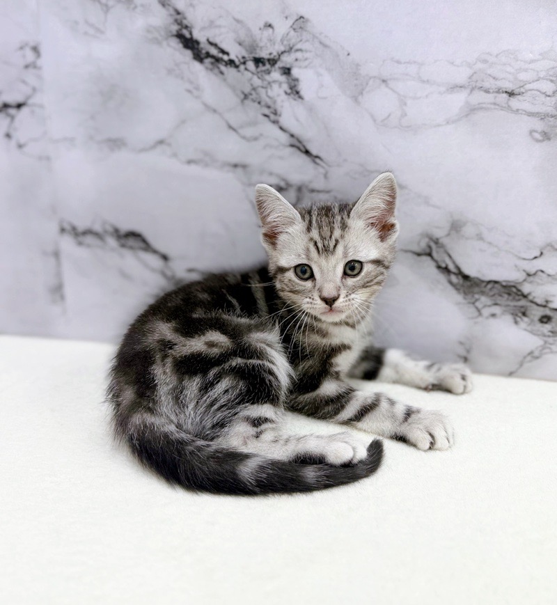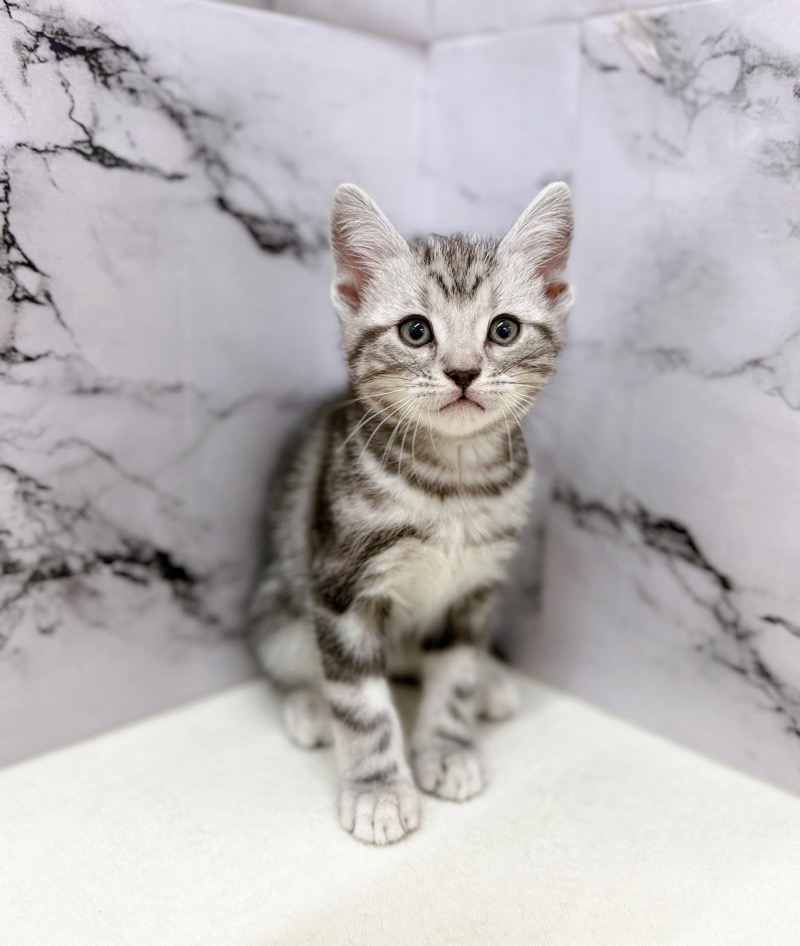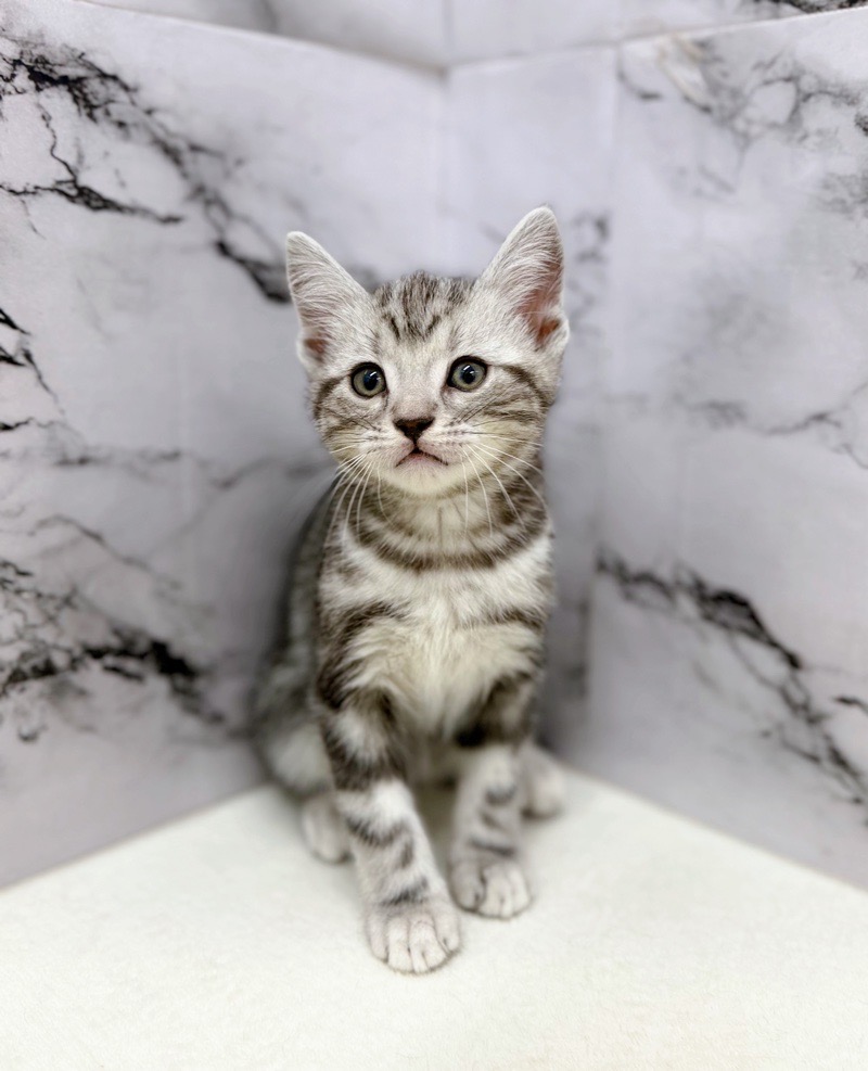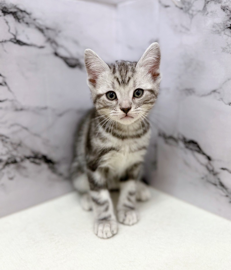 きれいなシルバータビー柄が映える男の子。ちょこんと座って見上げる姿にキュンです。