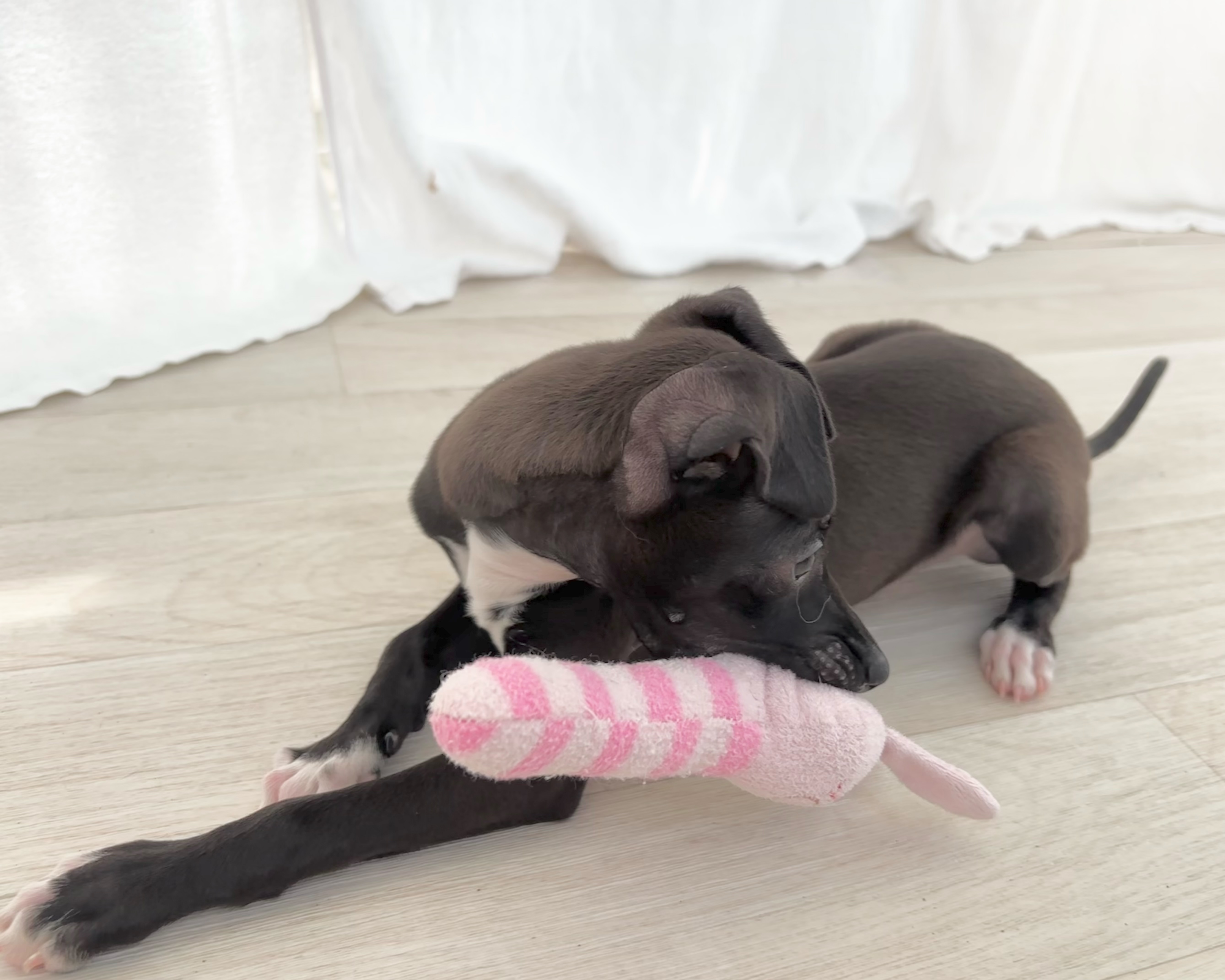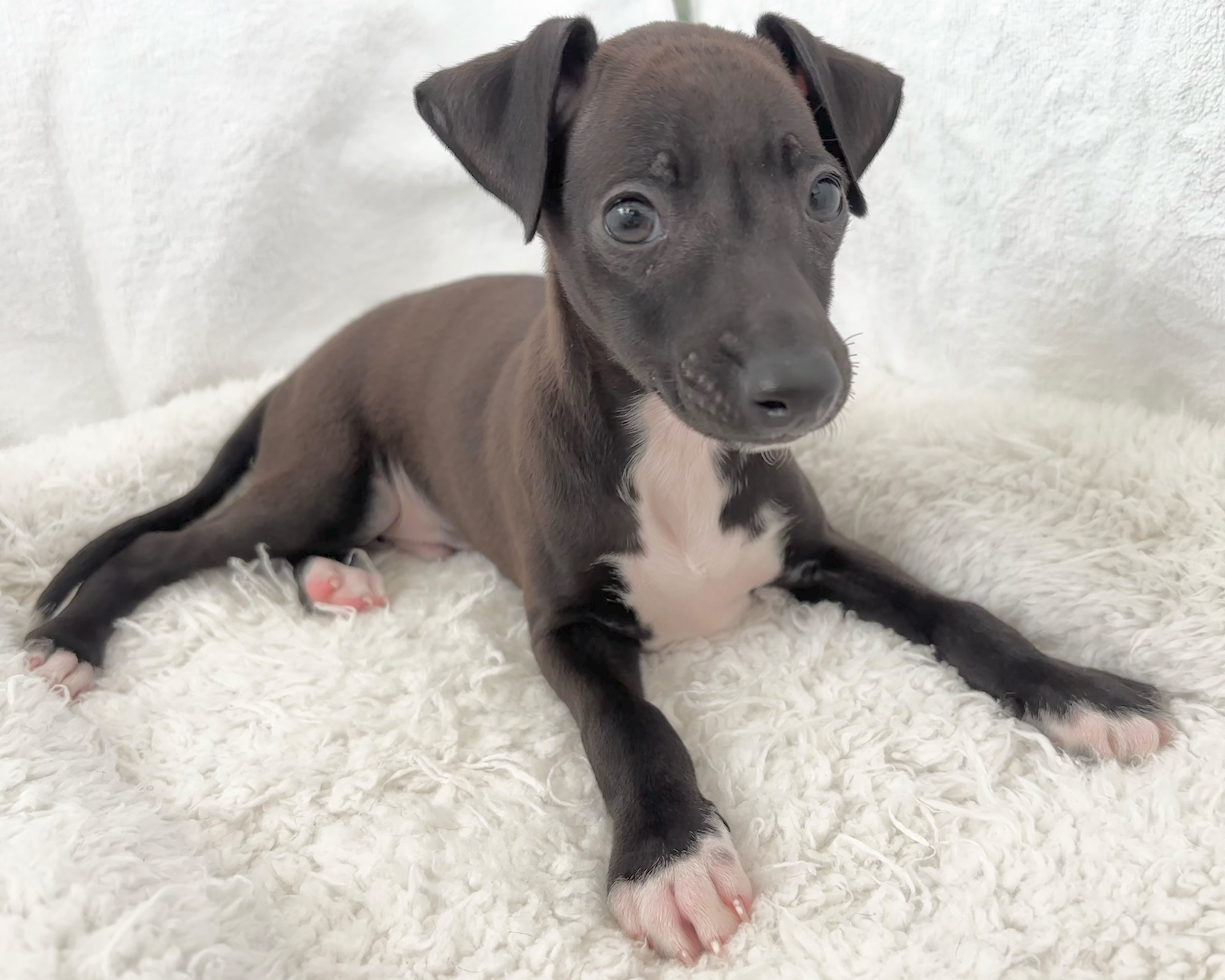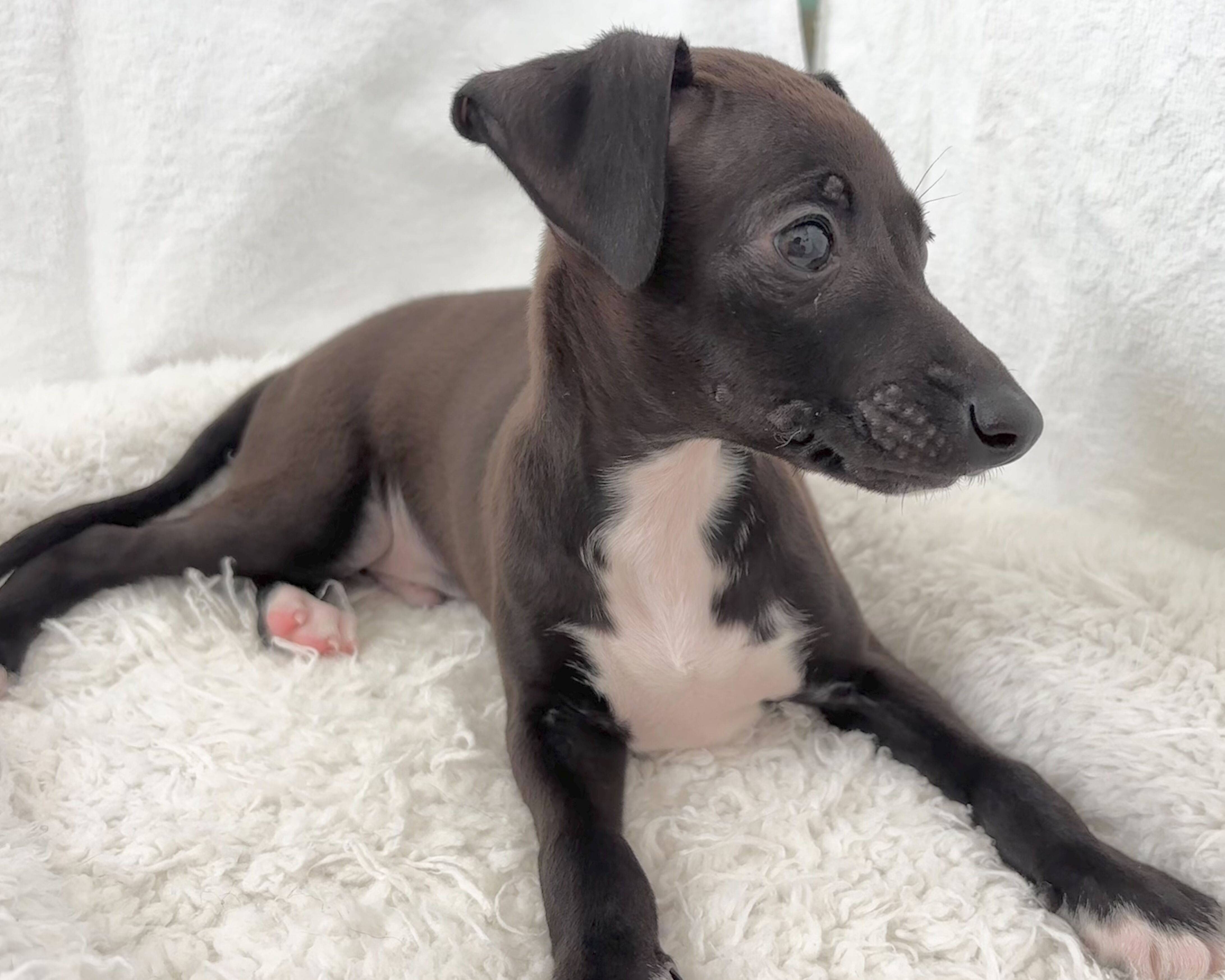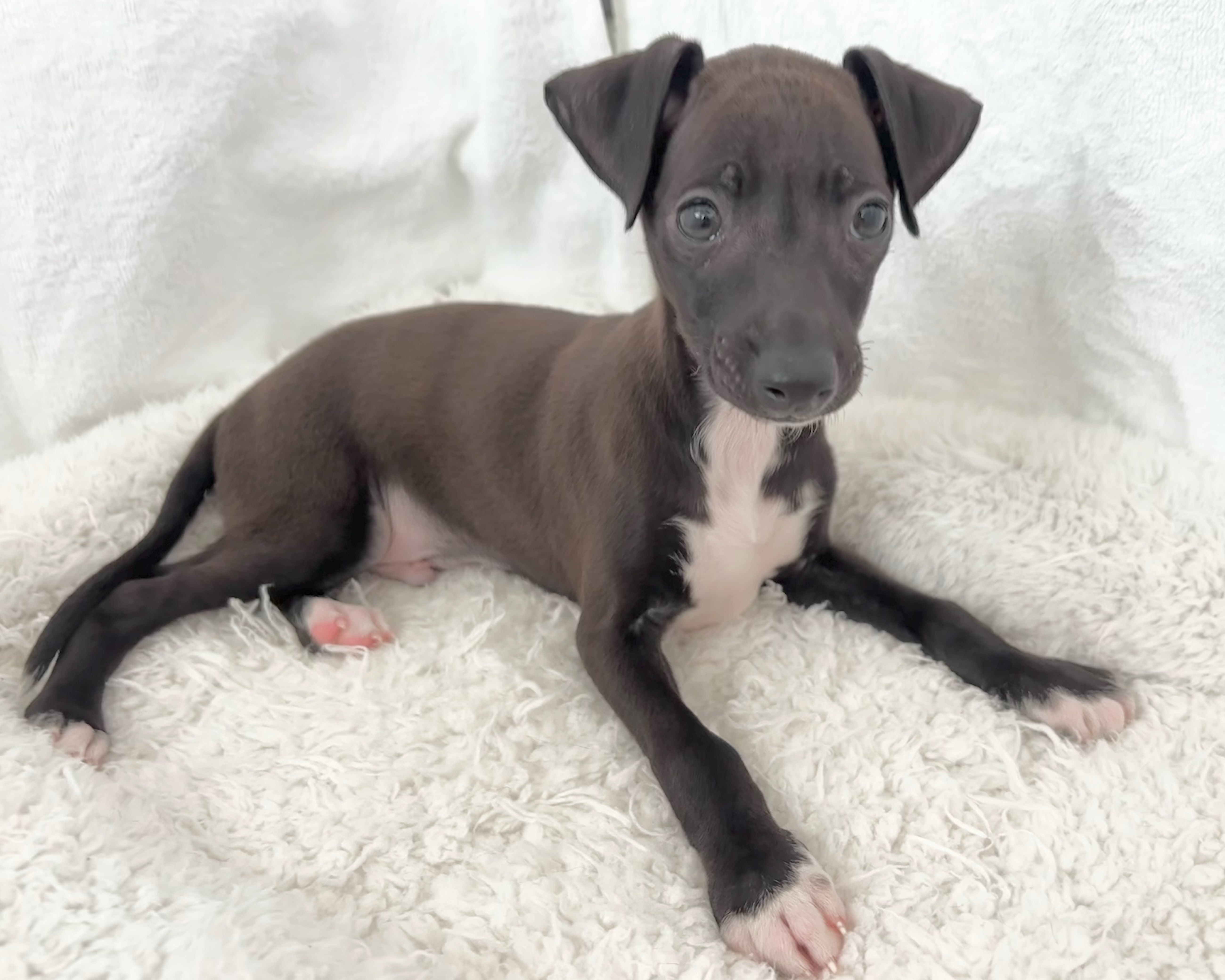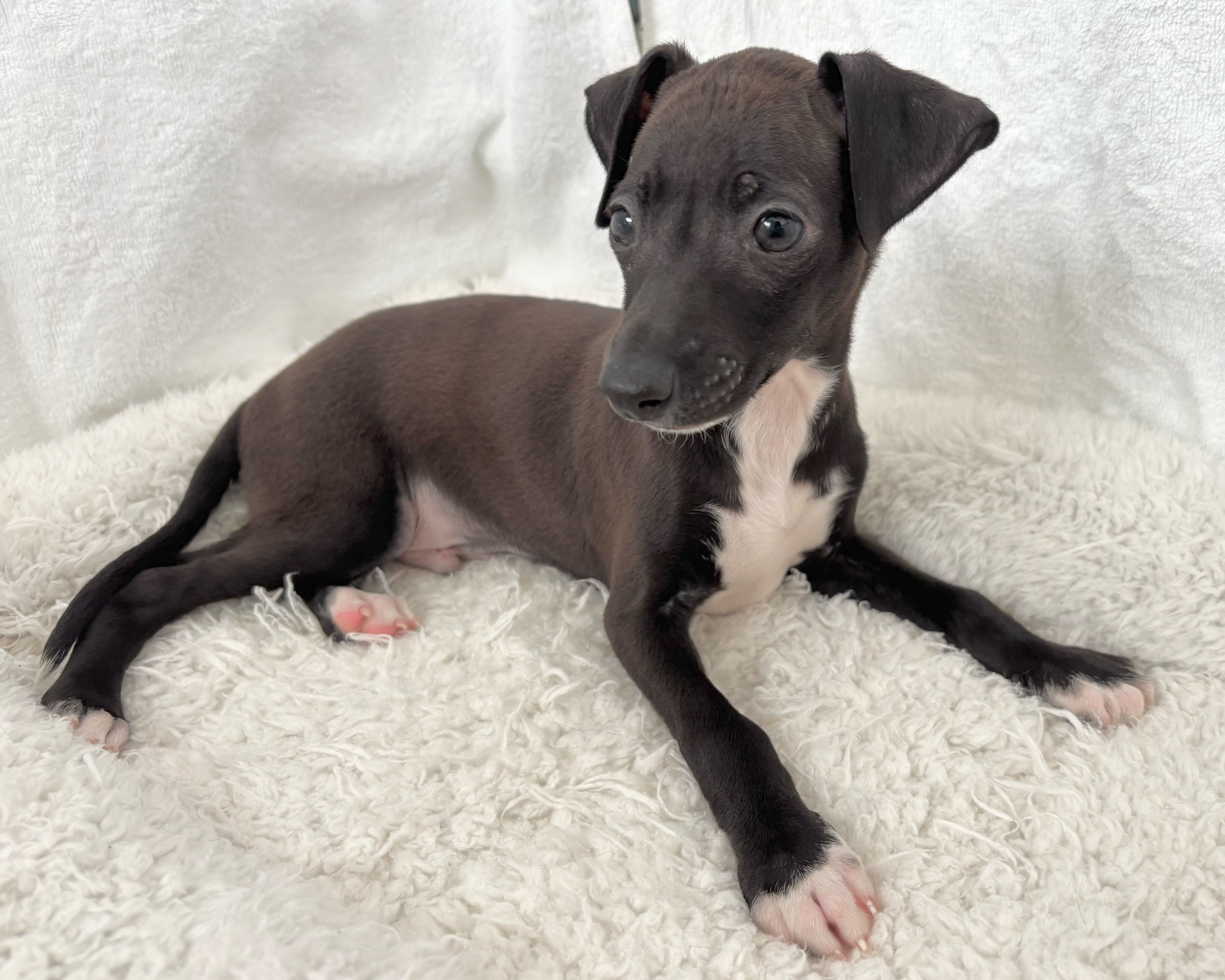 おとなしく穏やかな性格ながら、どこか芯の強さを感じさせる黒いイタリアングレーハウンドの男の子。