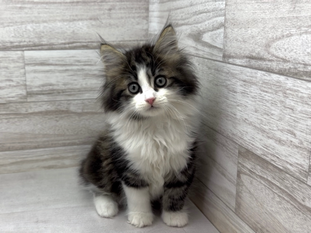 ふわふわの長毛と存在感のある美しいブラウンタビー&ホワイトの毛色が目を引く、サイベリアンの男の子です。豊かな毛並みは寒さに強い三層構造の被毛で、光の当たり方によって色合いの表情が変わる魅力的なコートが特徴。丸みのあるしっかりとした体格とバランスの取れたシルエットは、成長後の優雅さと力強さを予感させます。サイベリアンは世界中で愛される古くからの猫種で、その豪華な毛並みと立ち姿の美しさが多くのファンを魅了しています。遊び好きで好奇心旺盛、家の中でもアクティブに過ごせるポテンシャルを持つこの子は、ご家庭に迎え入れられる日を心待ちにしています。大きく成長しても美しさを保つ、存在感のある愛らしい一匹です。