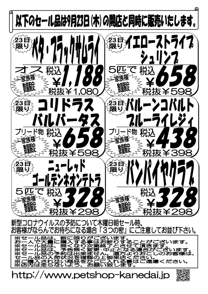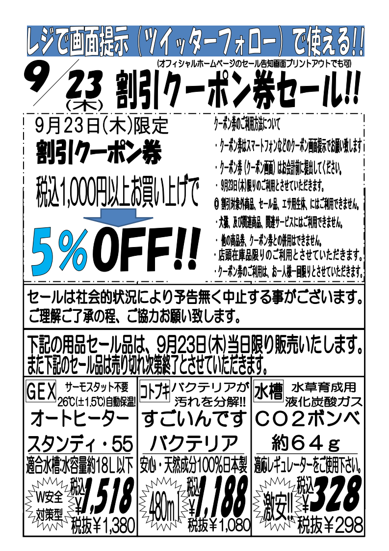 9月23日(木)レジで画面提示(ツイッターフォロー)で使える!!割引クーポン券セール!