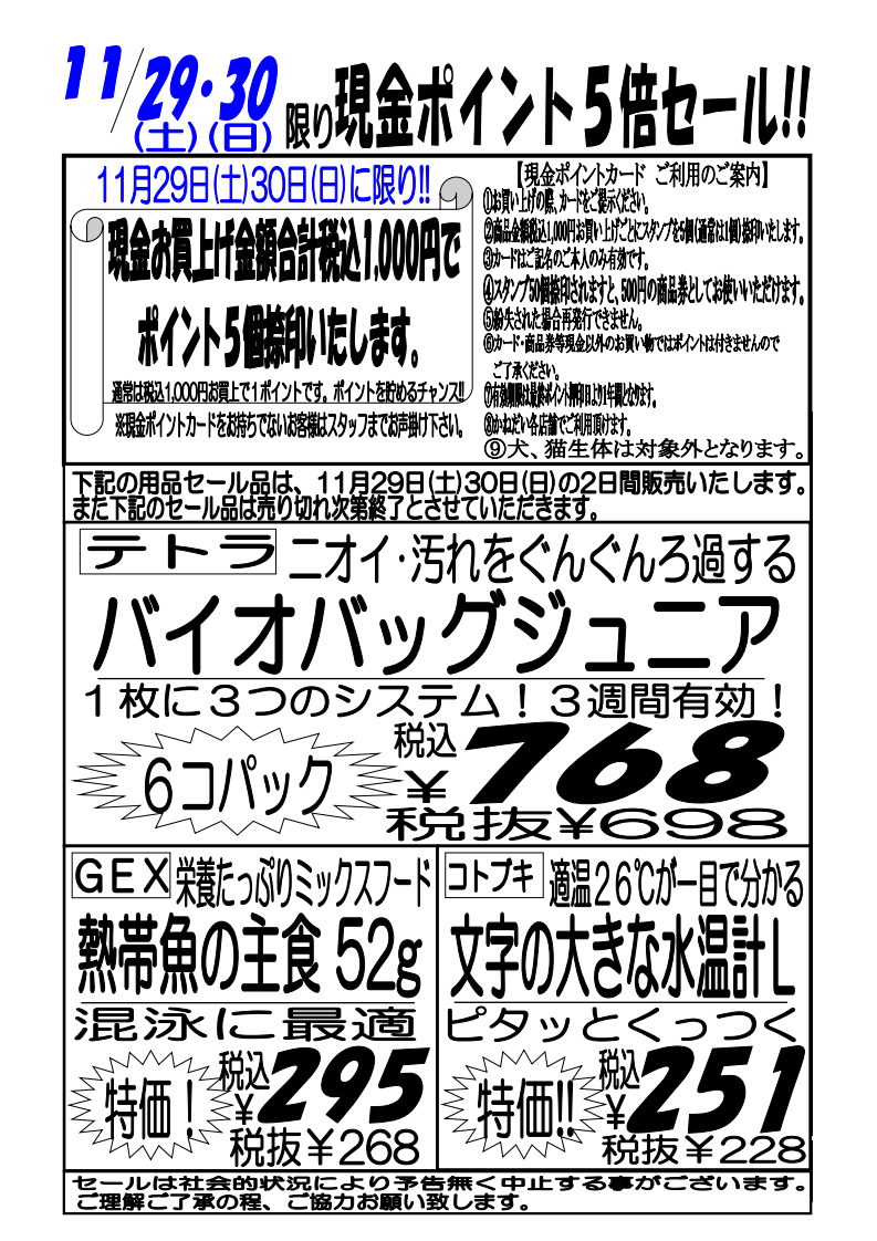 11月29日(土)~30日(日)現金ポイント5倍セール!