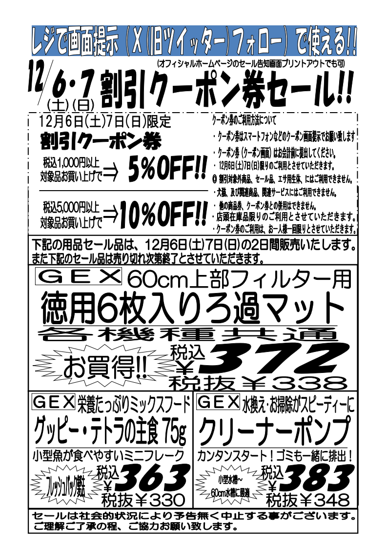 12月6日(土)〜7日(日)レジで画面提示(Xフォロー)で使える!!割引クーポン券セール!