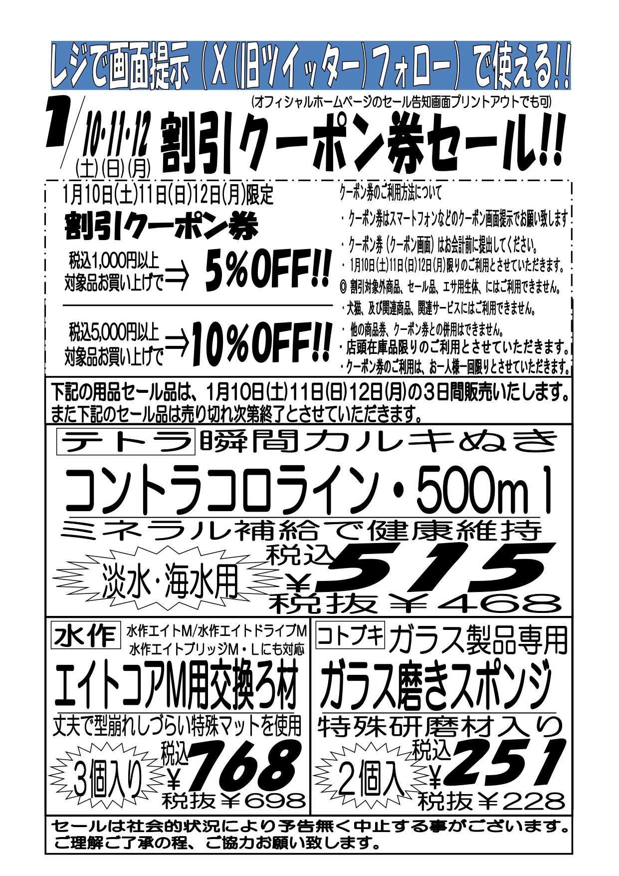 1月10日(土)〜12日(月)レジで画面提示(ツイッターフォロー)で使える!!割引クーポン券セール!