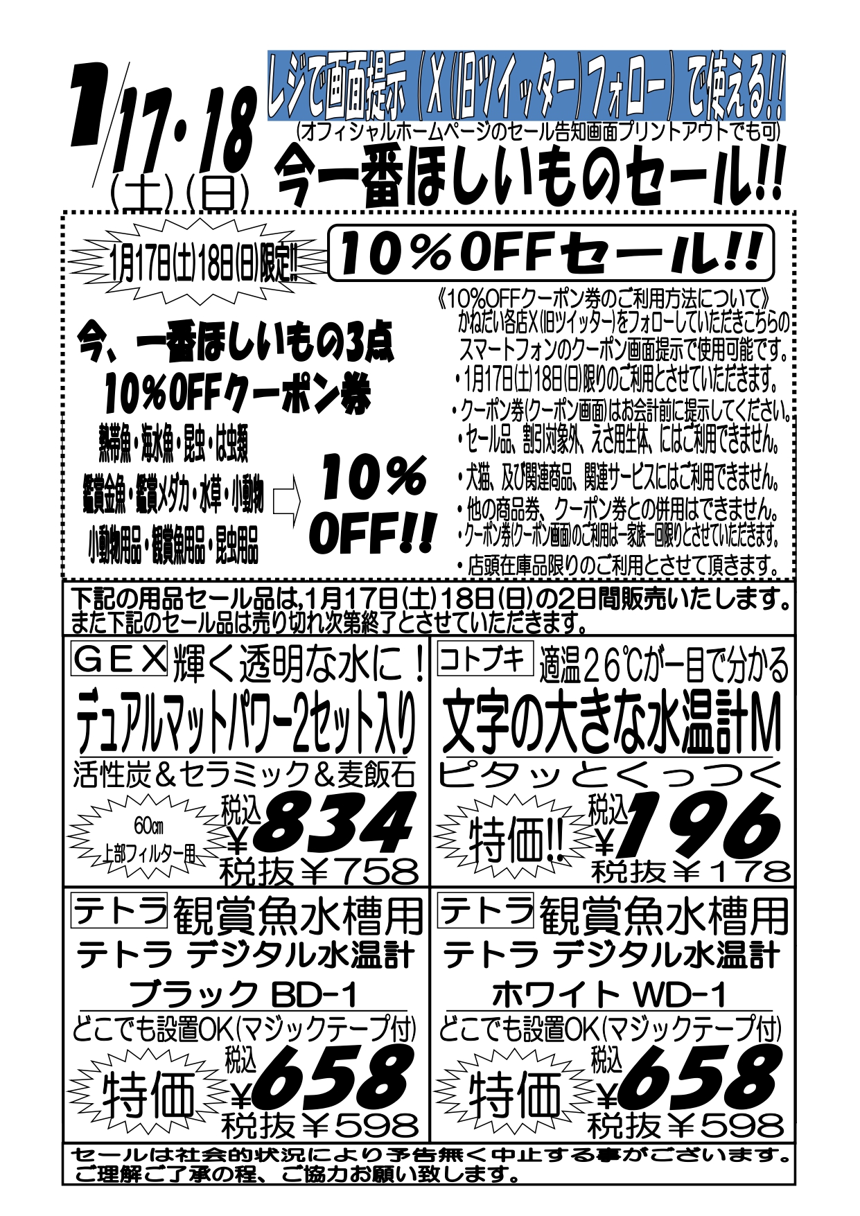 1月17日(土)〜18日(日)限定 10%クーポン割引のご利用について ・クーポン割引は、ご来店店舗のX(ツイッター)アカウントをフォロー頂き、各アカウントに掲載されている「クーポン画面」をスマートフォンなどで店頭でご提示いただければ受けられます。 ※クーポン画面の掲載は直前になる事もございます。掲載がなかった場合には、別途、時間をおいてから再確認をお願いいたします。 ・クーポン画面はお会計前にご提示下さい。 ・割引対象外商品、セール品、エサ用生体、犬、猫、犬猫用品、関連サービスにはご利用いただけません。 ・店頭在庫品限りのご利用とさせて頂きます。 ・1月17日(土)〜18日(日)限りのご利用とさせていただきます。 ・ご一家族様一回限りのご利用とさせていただきます。 ・ご利用店舗のツイッターアカウントのフォローのみ有効です。他店アカウントのフォローではご利用になれません。 ・店頭在庫品限りのご利用とさせて頂きます。 ・他の商品券、クーポン券との併用はできません。 |