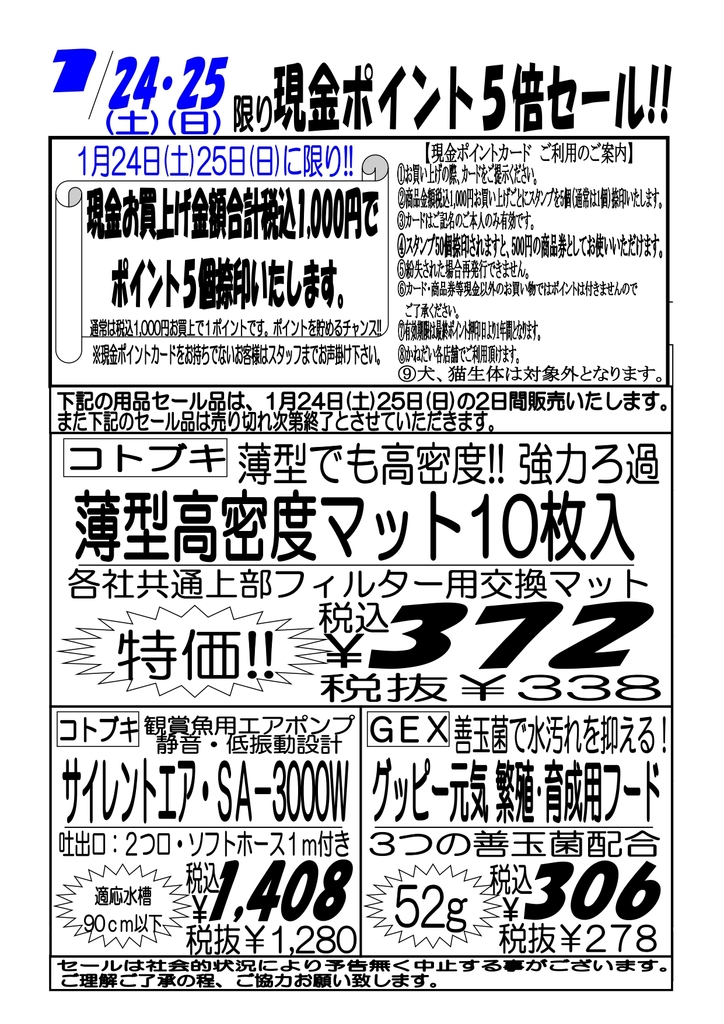 1月24日(土)~25日(日)現金ポイント5倍セール!