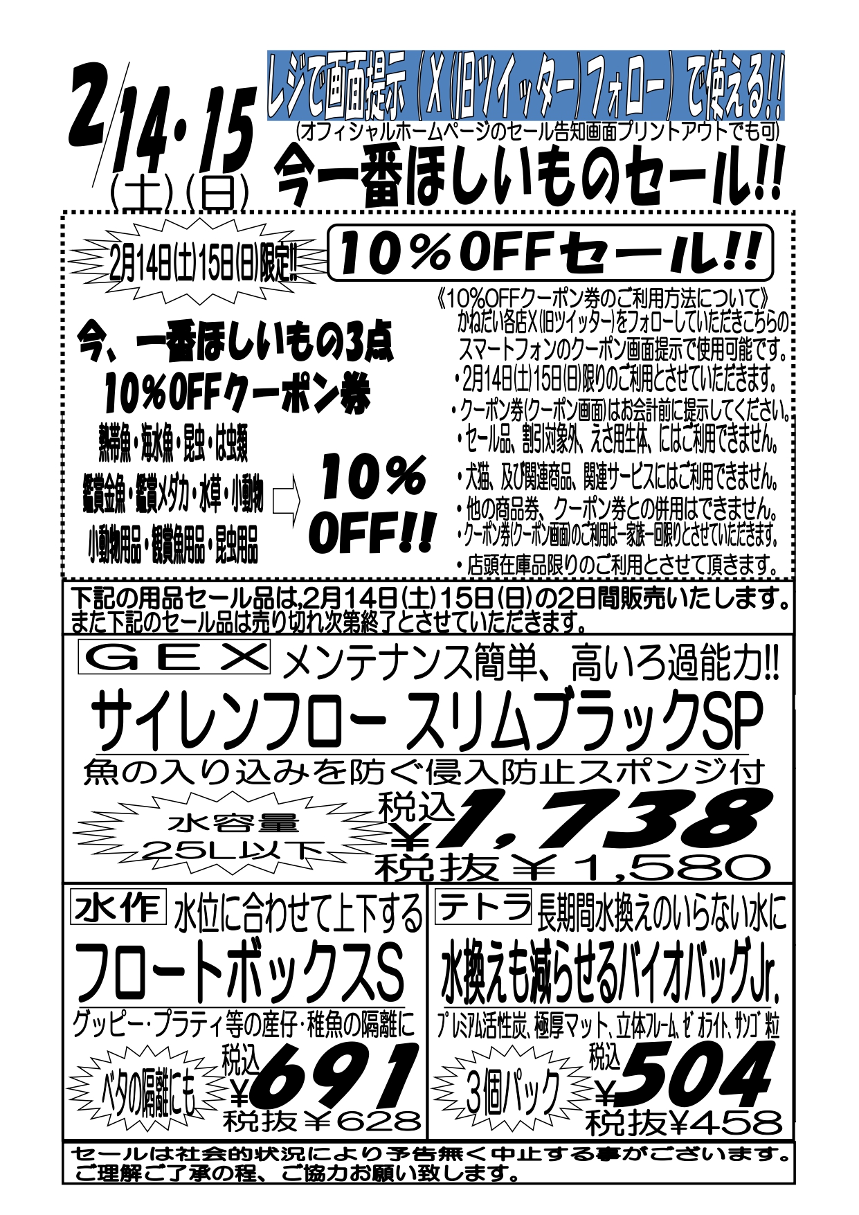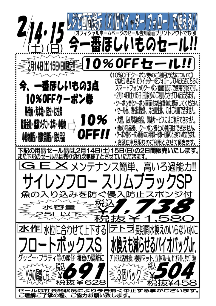 2月14日(土)〜15日(日)限定 10%クーポン割引のご利用について ・クーポン割引は、ご来店店舗のX(ツイッター)アカウントをフォロー頂き、各アカウントに掲載されている「クーポン画面」をスマートフォンなどで店頭でご提示いただければ受けられます。 ※クーポン画面の掲載は直前になる事もございます。掲載がなかった場合には、別途、時間をおいてから再確認をお願いいたします。 ・クーポン画面はお会計前にご提示下さい。 ・割引対象外商品、セール品、エサ用生体、犬、猫、犬猫用品、関連サービスにはご利用いただけません。 ・店頭在庫品限りのご利用とさせて頂きます。 ・2月14日(土)〜15日(日)限りのご利用とさせていただきます。 ・ご一家族様一回限りのご利用とさせていただきます。 ・ご利用店舗のツイッターアカウントのフォローのみ有効です。他店アカウントのフォローではご利用になれません。 ・店頭在庫品限りのご利用とさせて頂きます。 ・他の商品券、クーポン券との併用はできません。 |