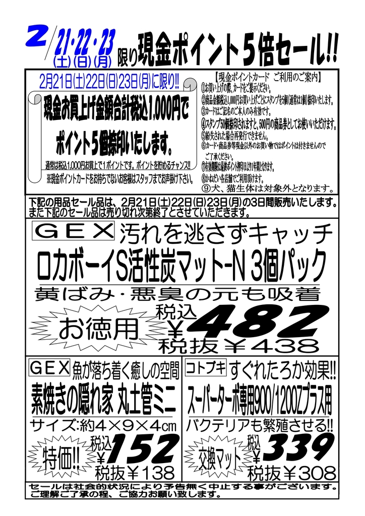 2月21日(土)~23日(月)現金ポイント5倍セール!