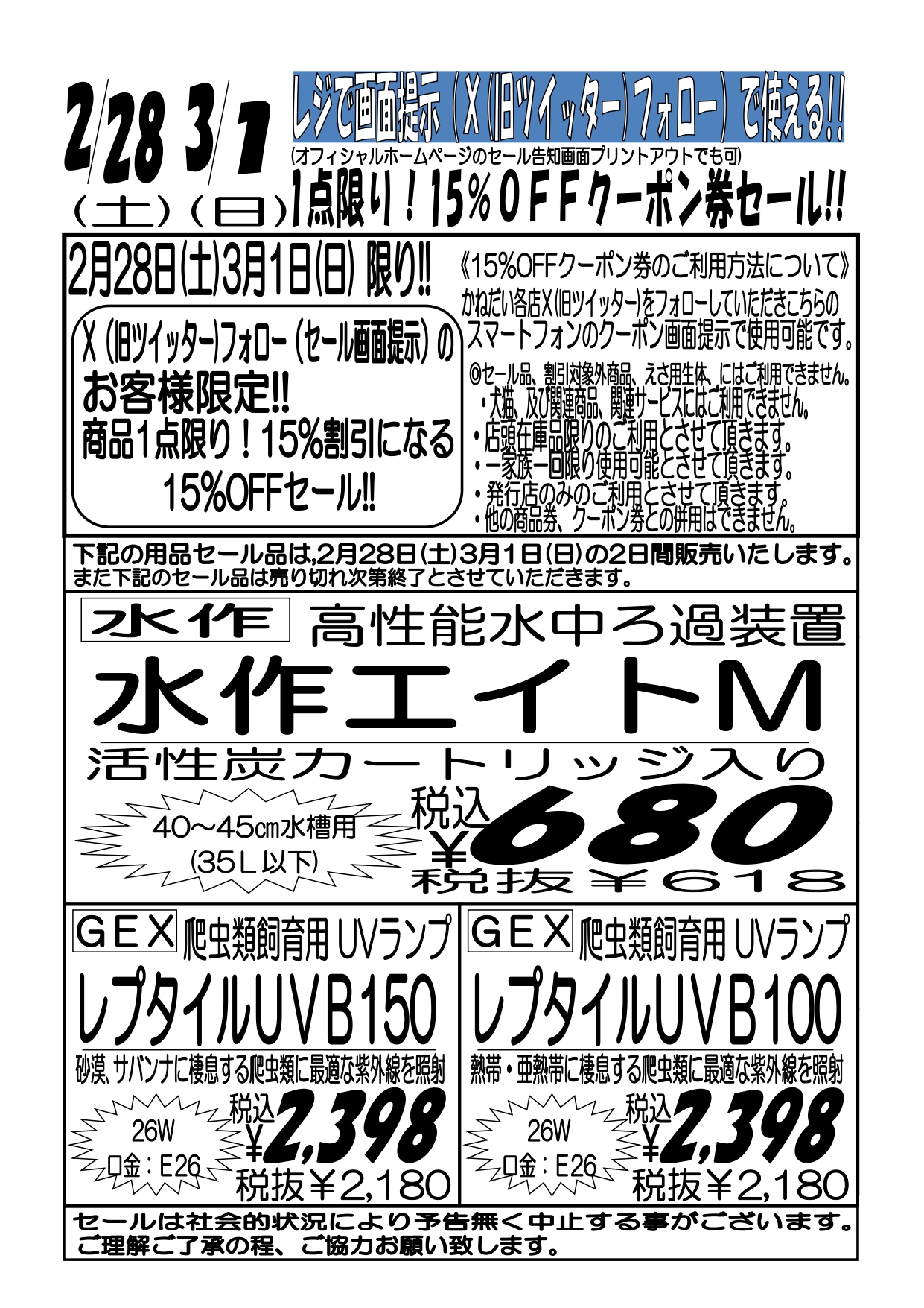 2月28日(土)〜3月1日(日)レジで画面提示(Xフォロー)で使える!!1点限り!15%OFFクーポン券セール!
