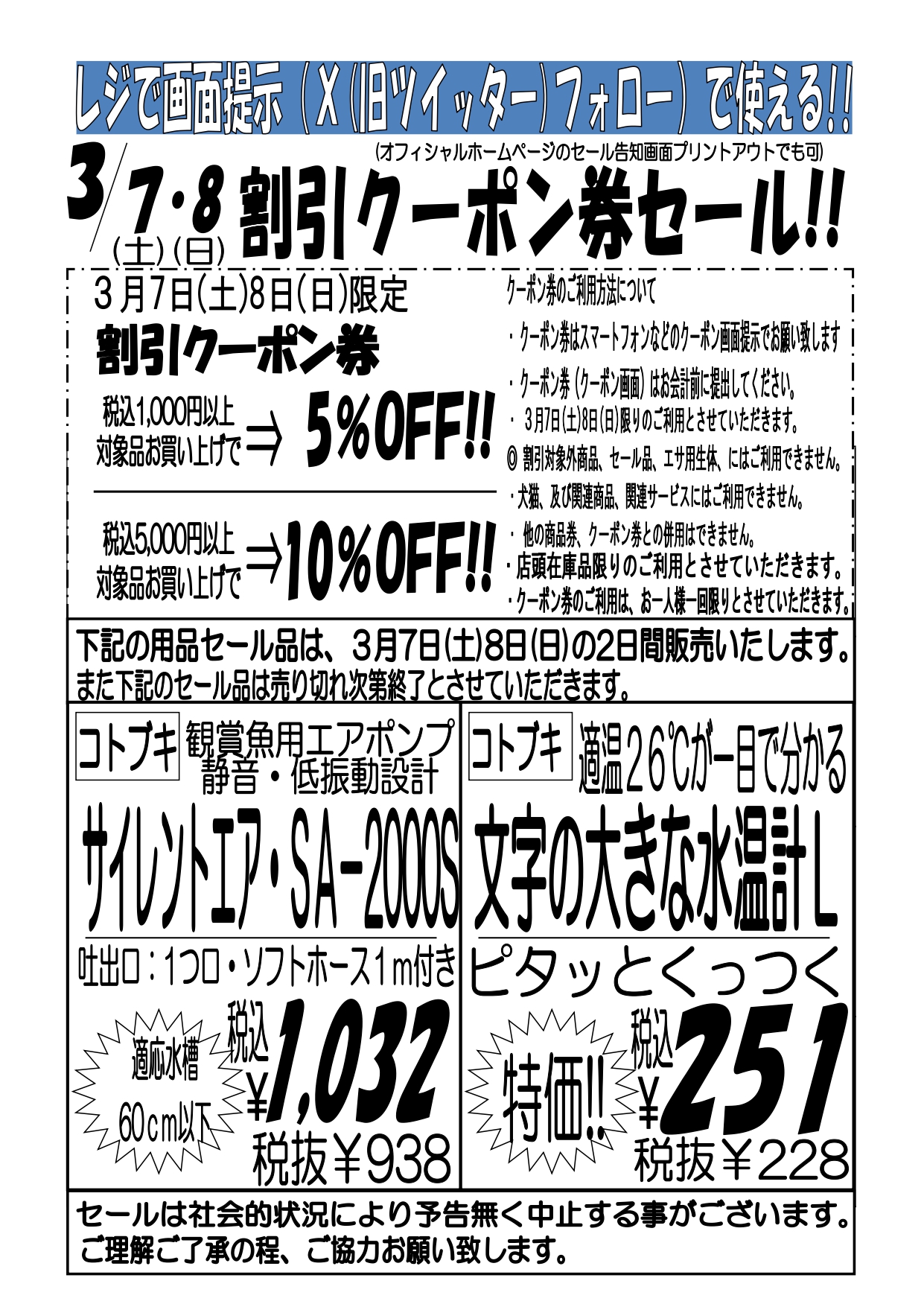 3月7日(土)〜8日(日)レジで画面提示(ツイッターフォロー)で使える!!割引クーポン券セール!