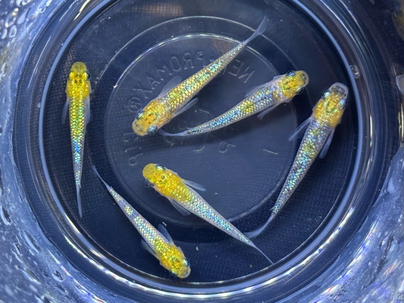 上州めだか様作出。黄金体色×蒼煌ルーツの青ラメがぎっしり。上見でギラッと光る“主役級”のラメ系です。