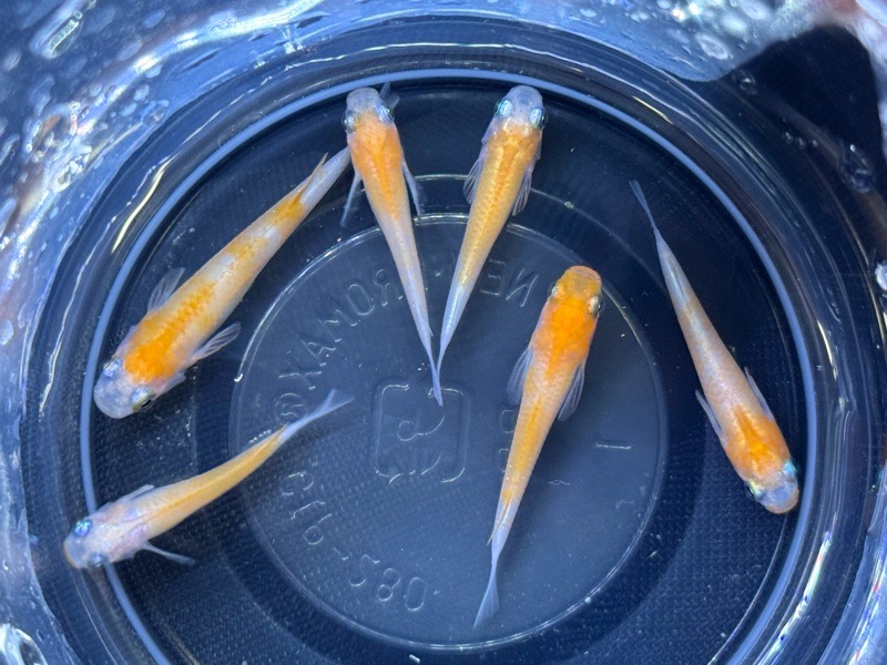 濃い白地に鮮やかな朱赤が映える、上品で華やかな非透明鱗メダカ。