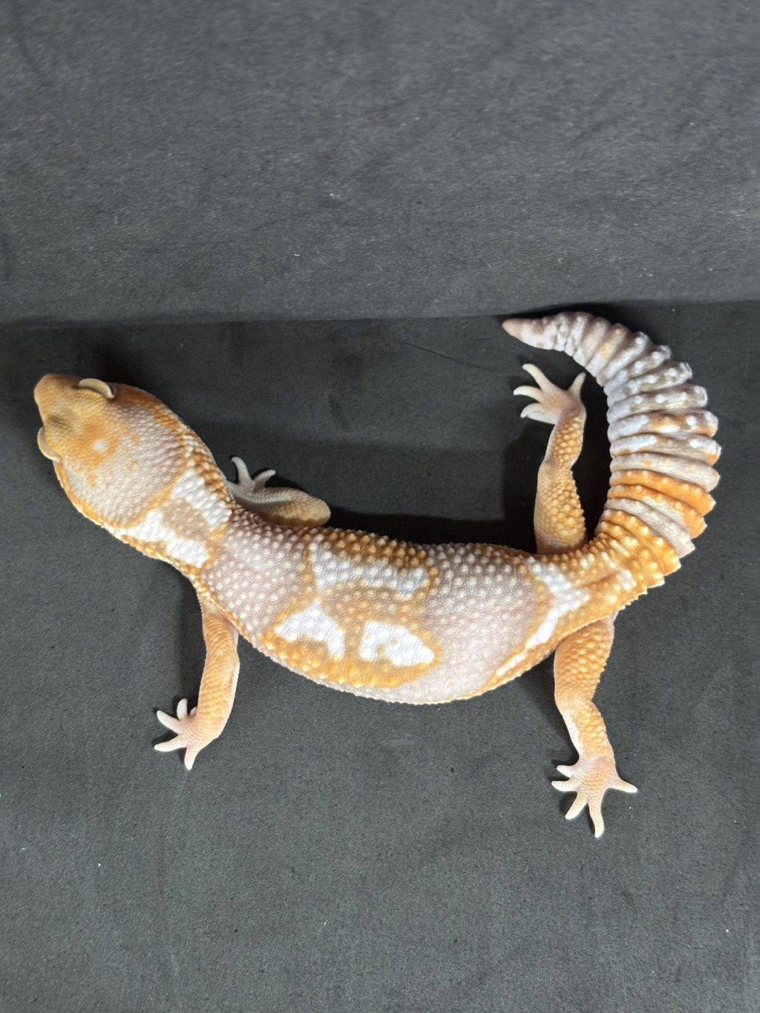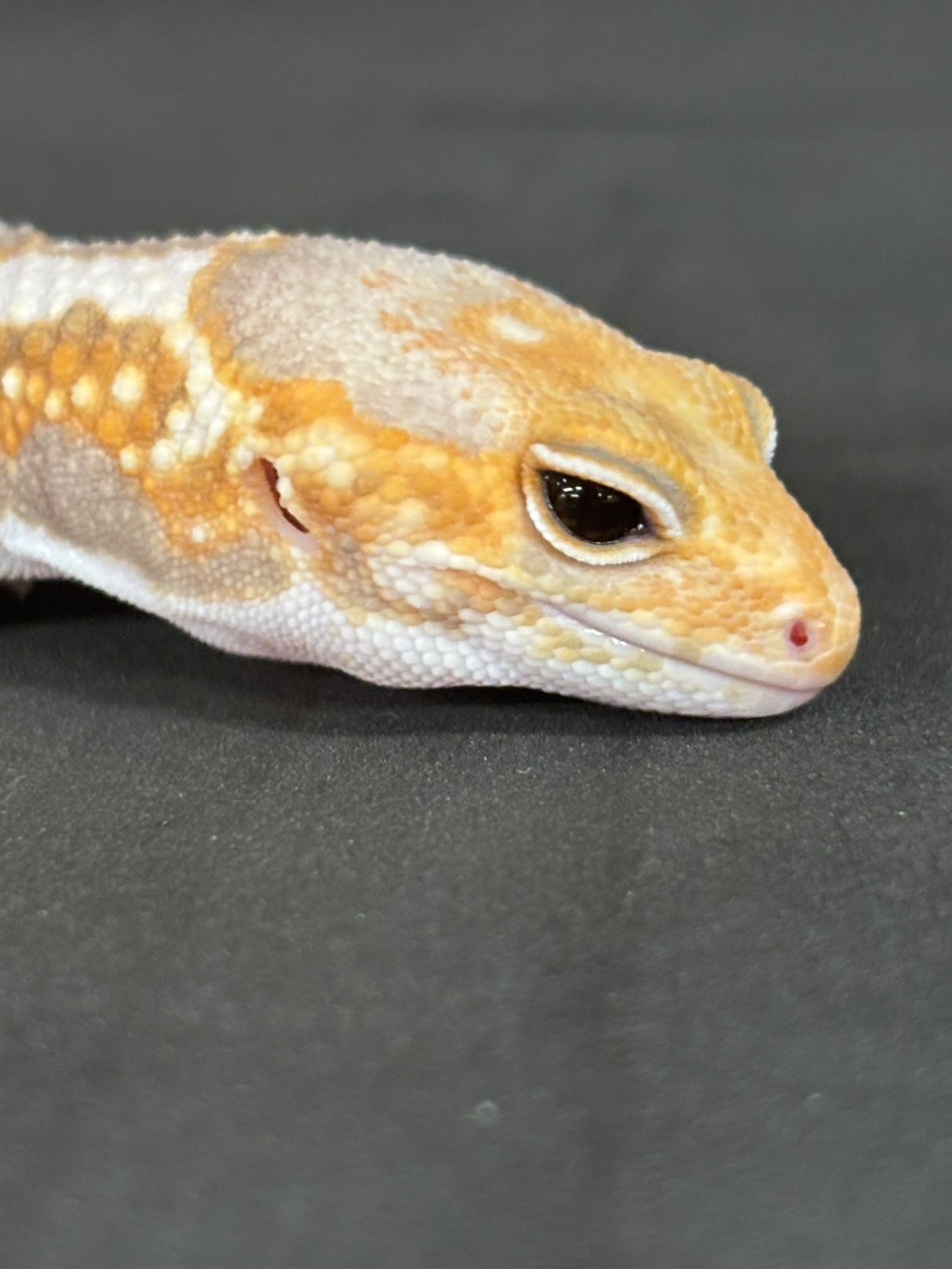 ホワイトアウトアメルは白基調の体色にアメルのオレンジ模様が特徴的です。現在15cmほどで尻尾も太く健康的な個体です。