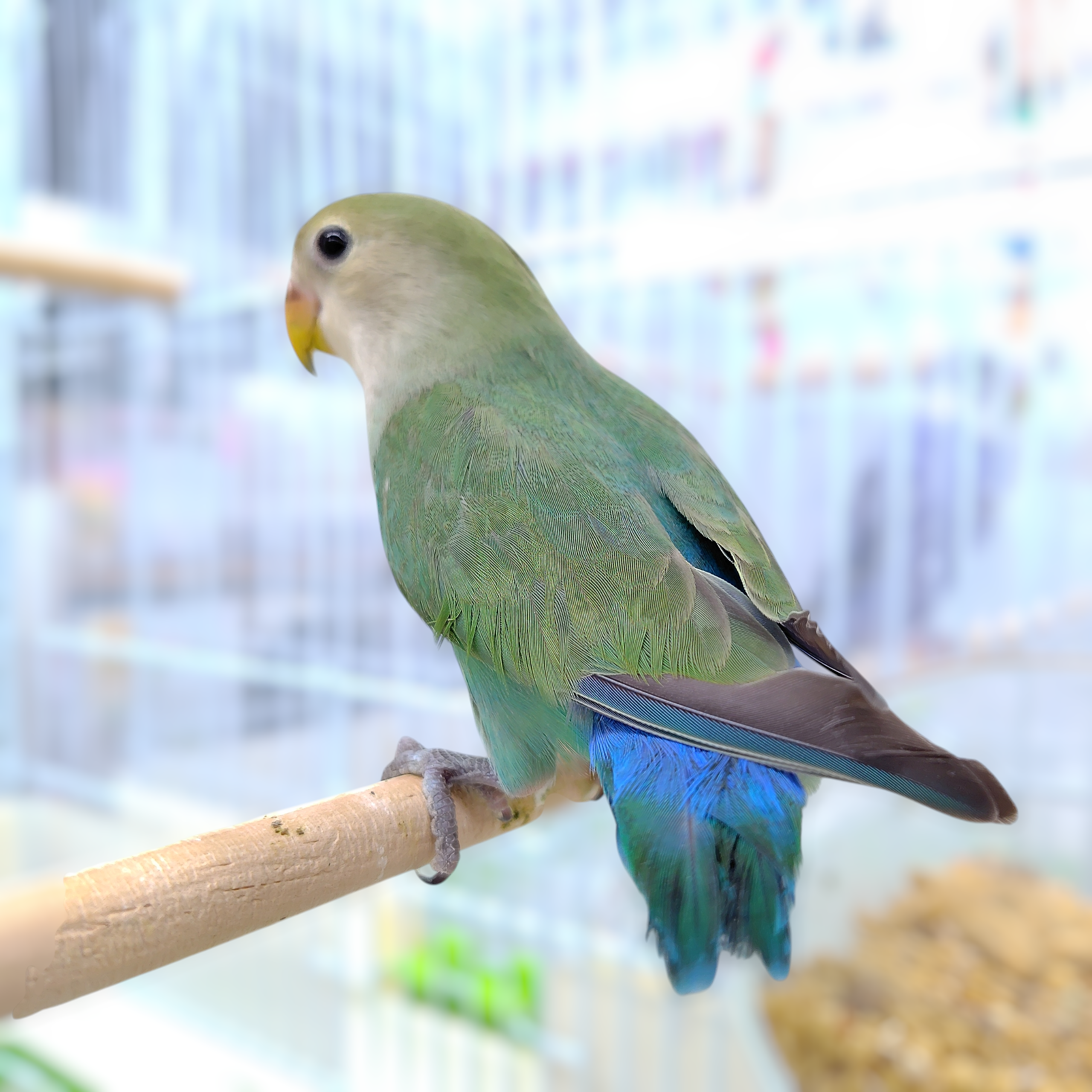 淡いグリーンに青い尾羽がとても美しい、シーグリーンカラーのコザクラインコの雛です。
