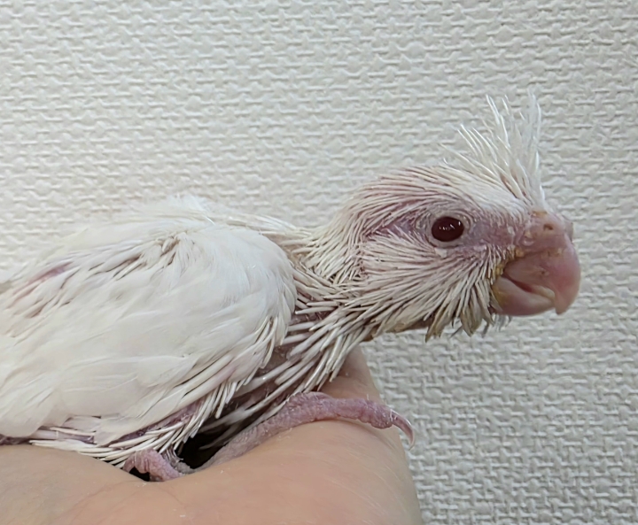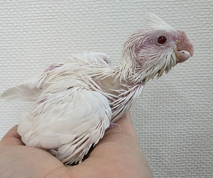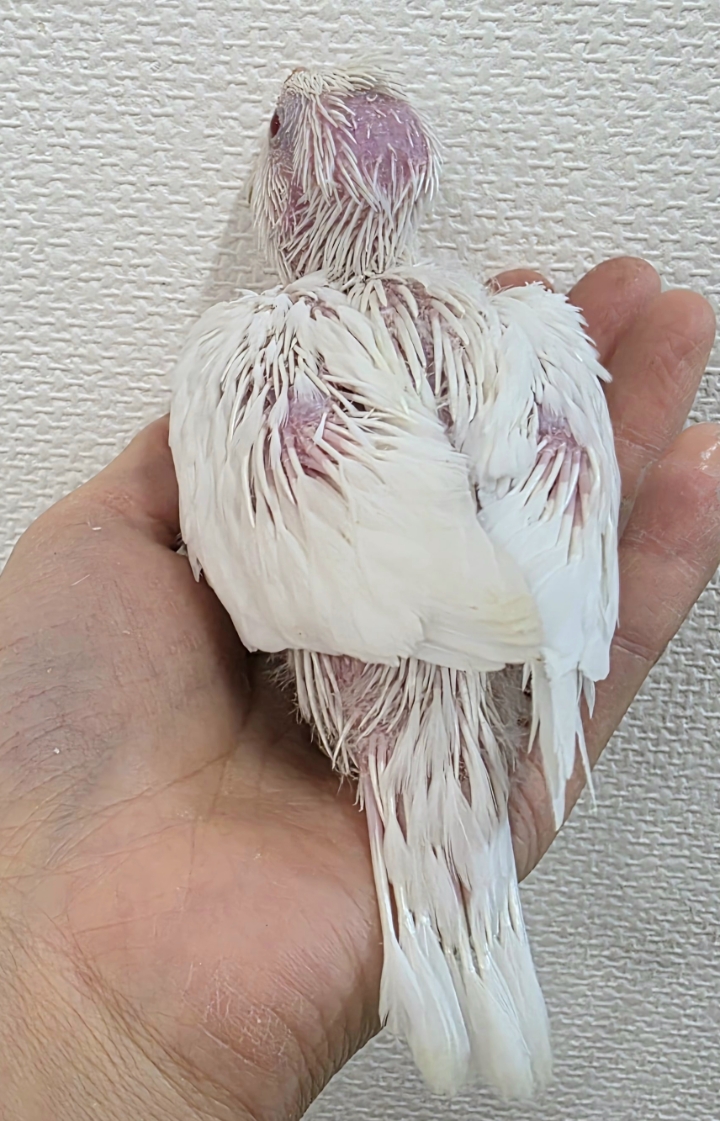 ・特徴:全身が白く、赤みのある瞳/成長途中の筆毛が残るひな(写真の様子より)