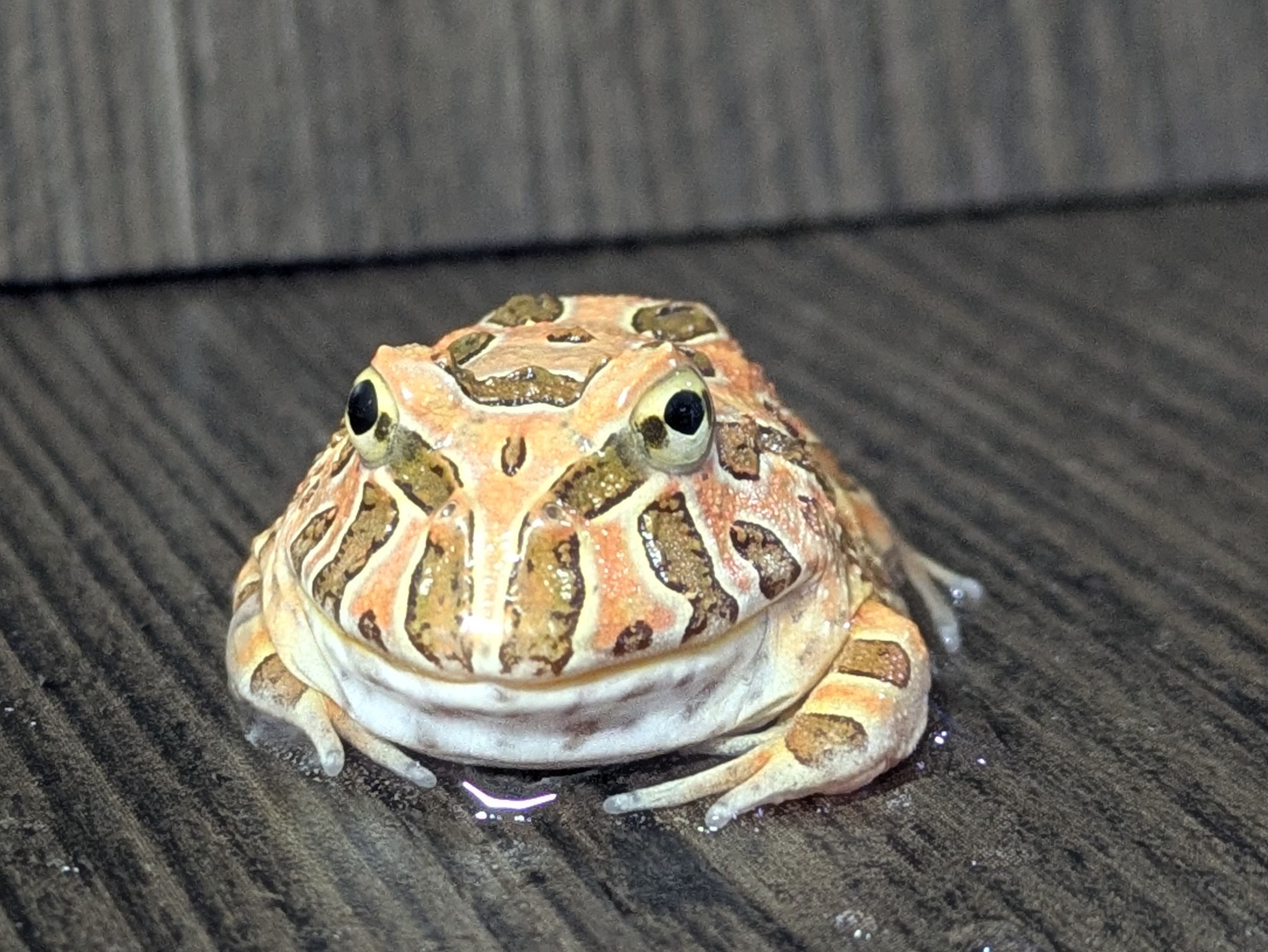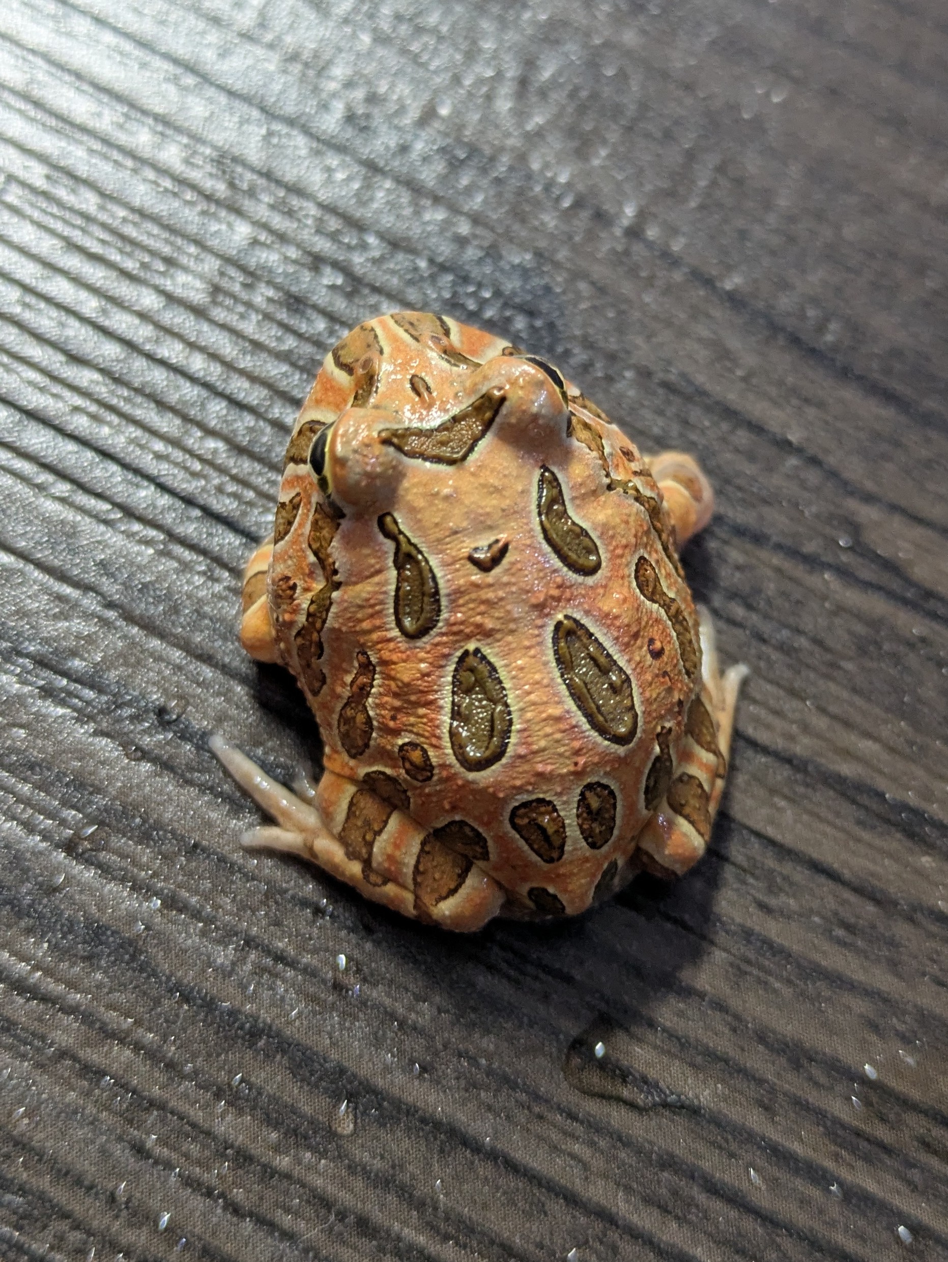 ほんのりオレンジがかったベースカラーに、カフィー特有の落ち着いたブラウン模様が美しく乗ったクランウェルツノガエルです。
