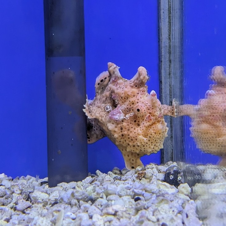 鮮やかなオレンジカラーと、ずんぐり丸い独特のフォルムが目を引くクマドリカエルアンコウ。