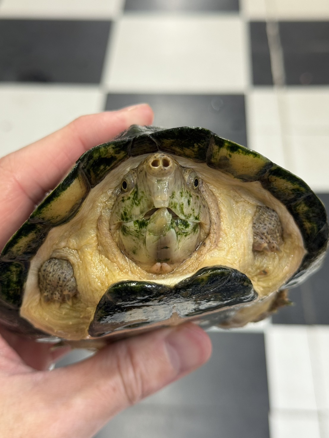 丸みのある甲羅と小型で引き締まった体つきが特徴で、水中では底を歩くように移動する落ち着いた行動が見られます。